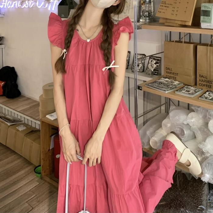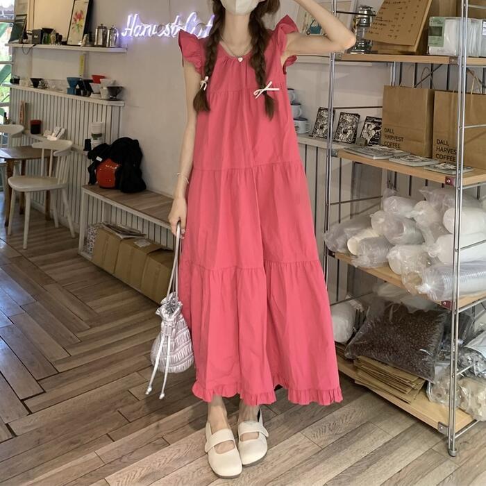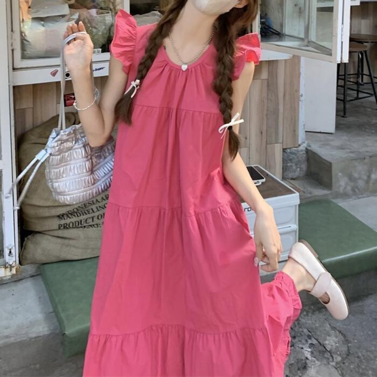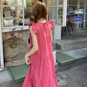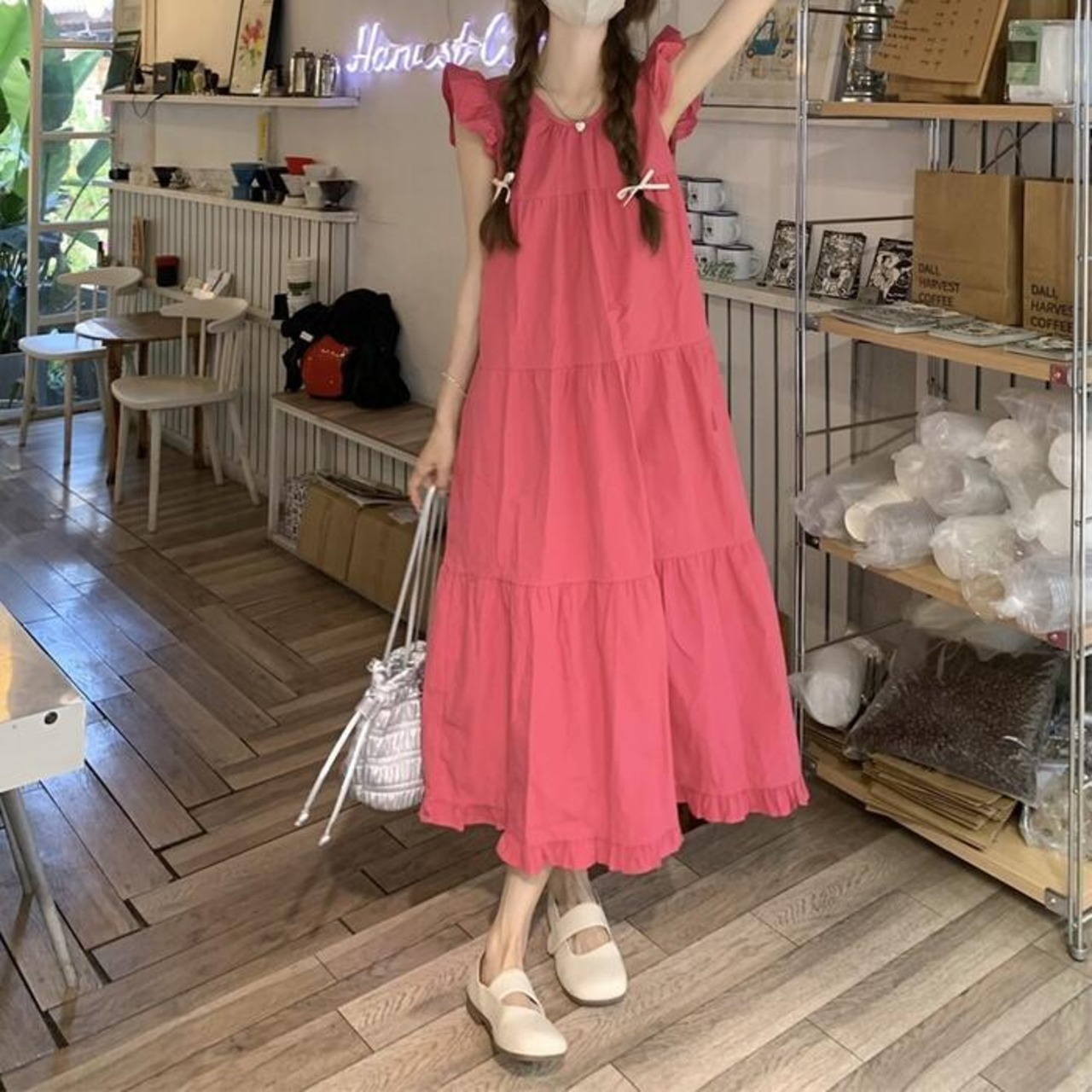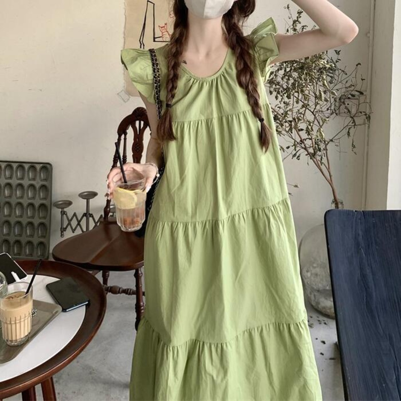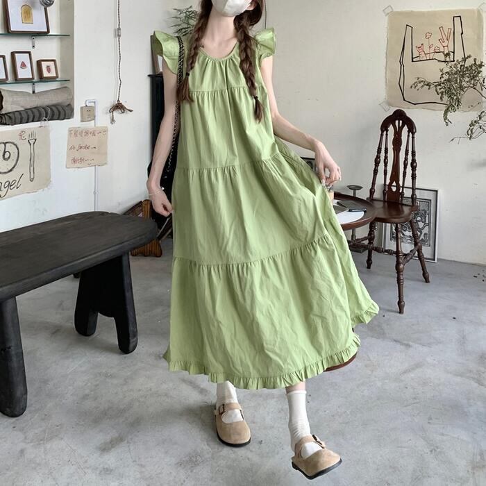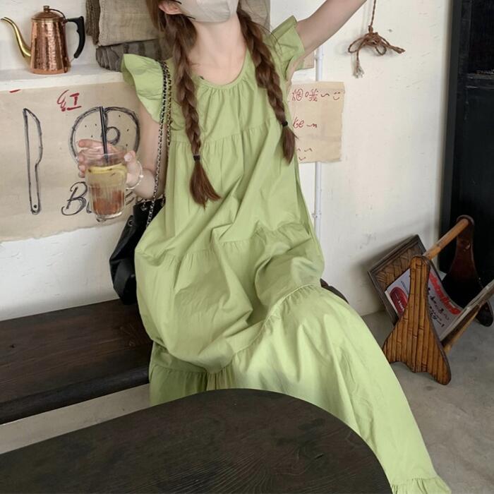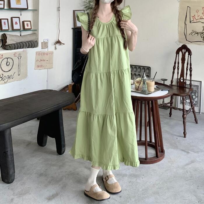 全2色 ティアード ワンピース ワンピ ドレス レディース エレガント きれいめ カジュアル 半袖 フリル 大人 可愛い フェミニン Aライン ロング丈 切り替え ゆったり シンプル 無地 体型カバー リラックス ピンク グリーン 緑 春 秋 夏 20代 30代 40代 50代