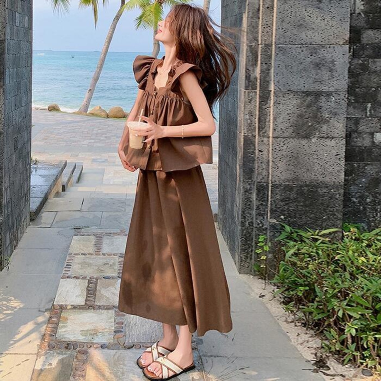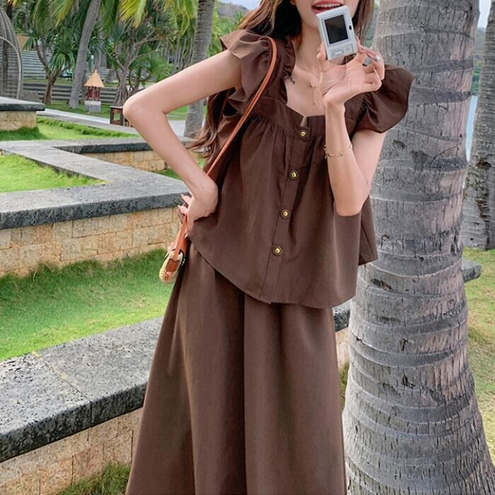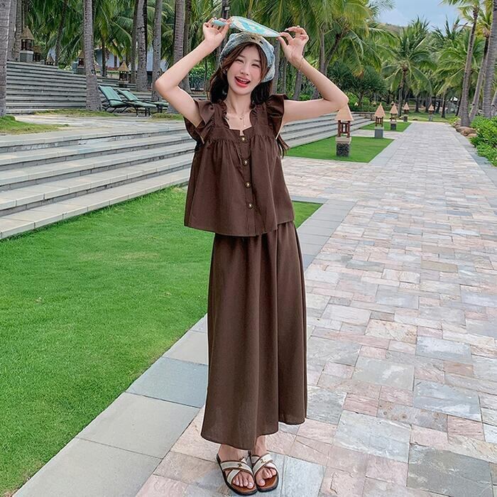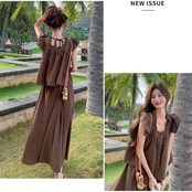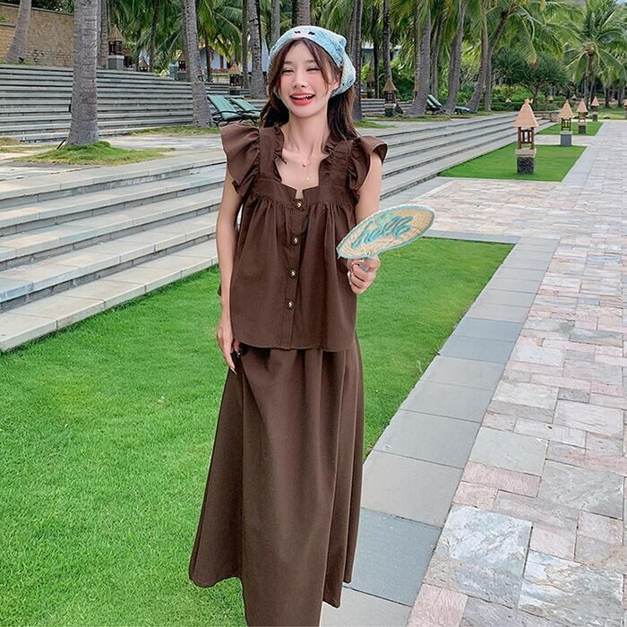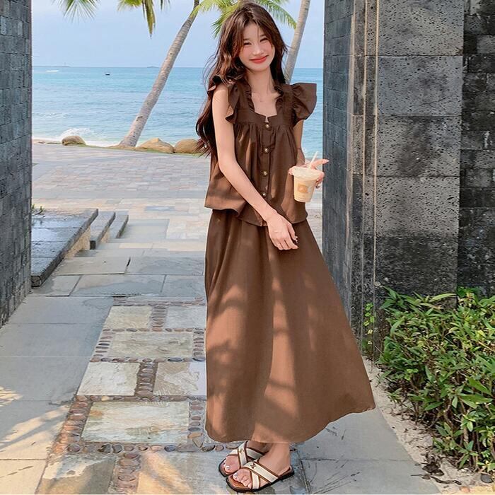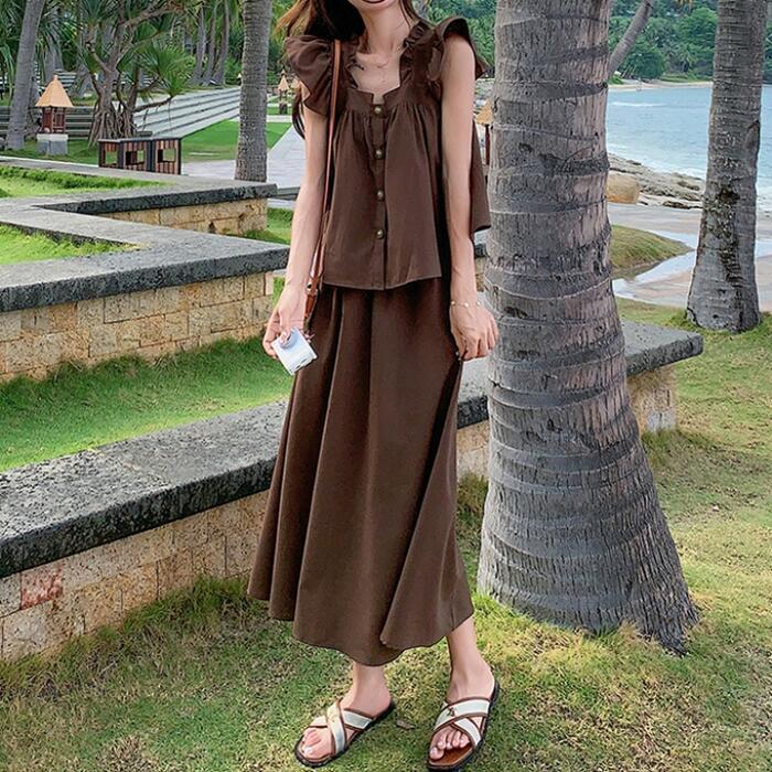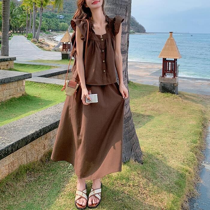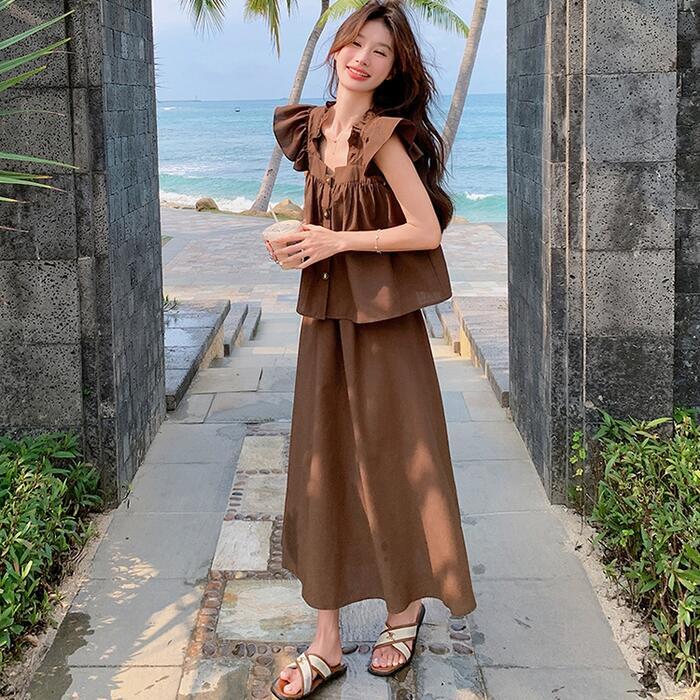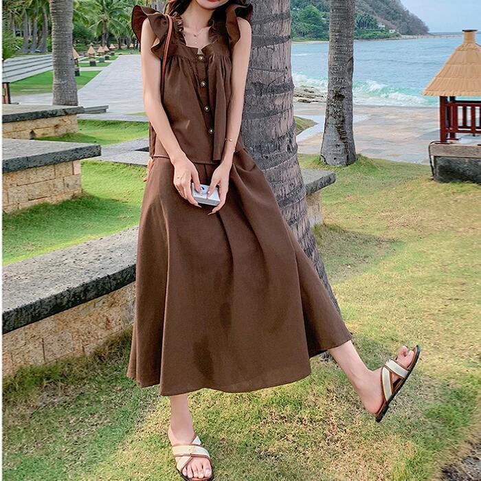 大きいサイズ レイヤード セットアップ 2点セット トップス スカート フリル レディース ロングスカート エレガント きれいめ カジュアル 大人 可愛い ノースリーブ 体型カバー ワンピース ツーピース ブラウン 春 秋 夏 20代 30代 40代 50代
