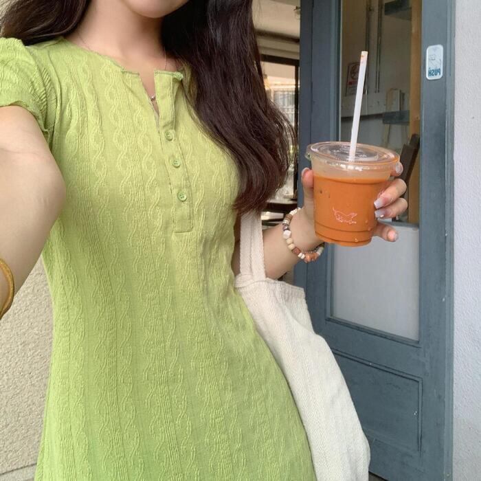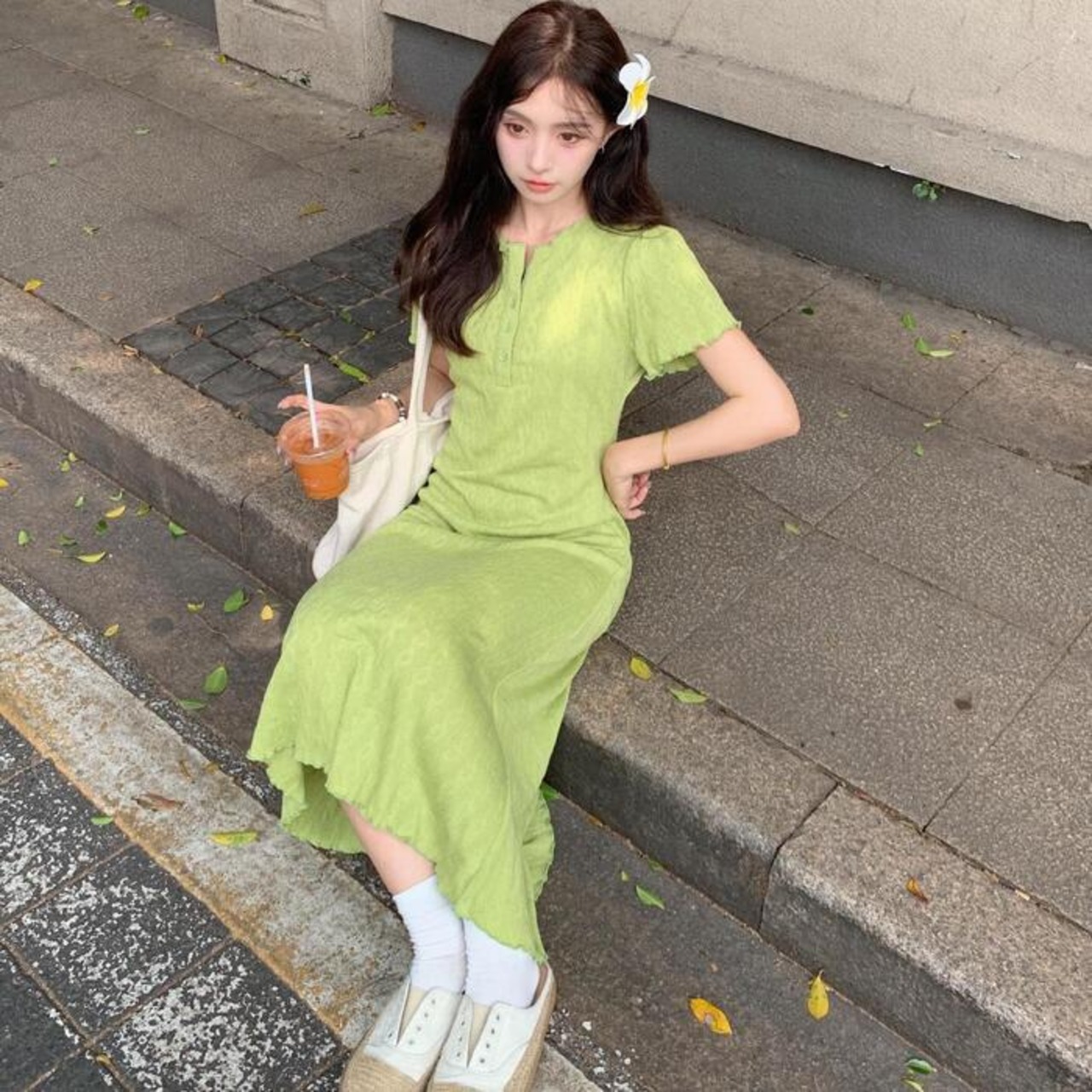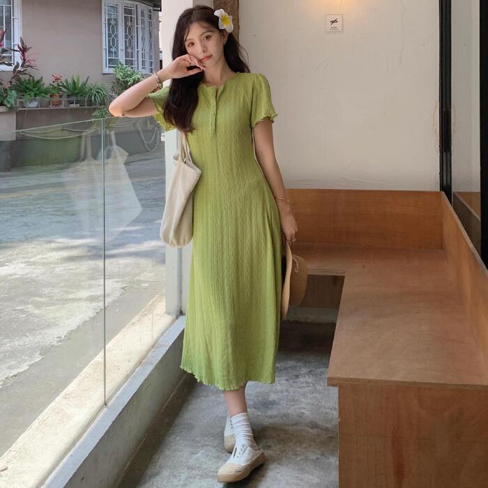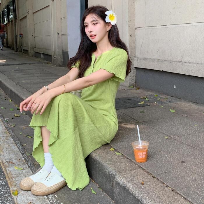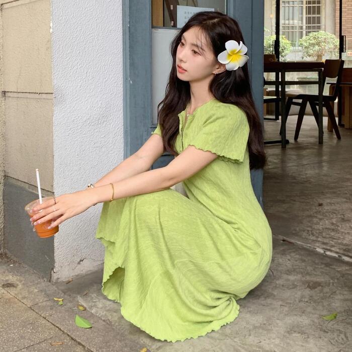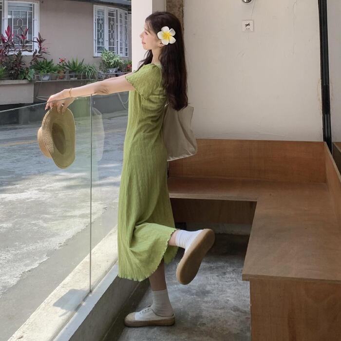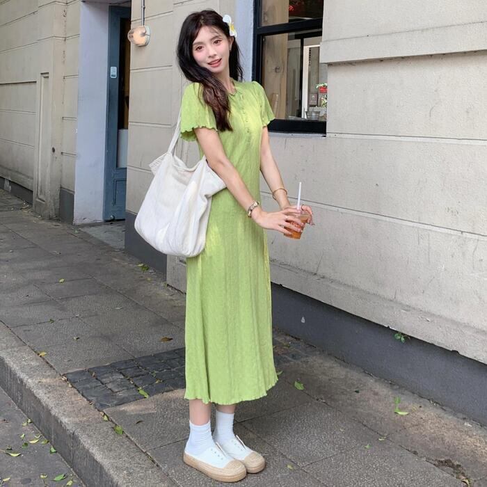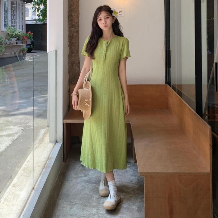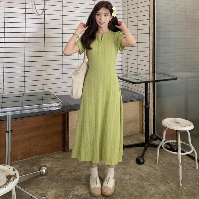きれいなグリーンカラーが目を惹くサマーニットワンピース。