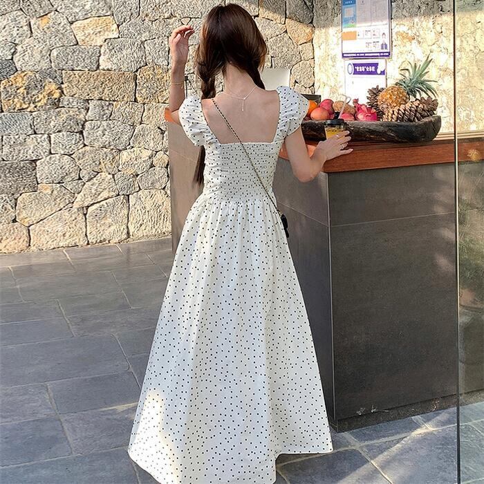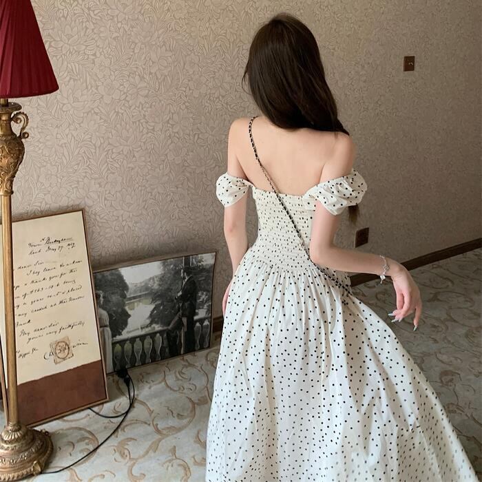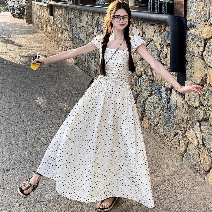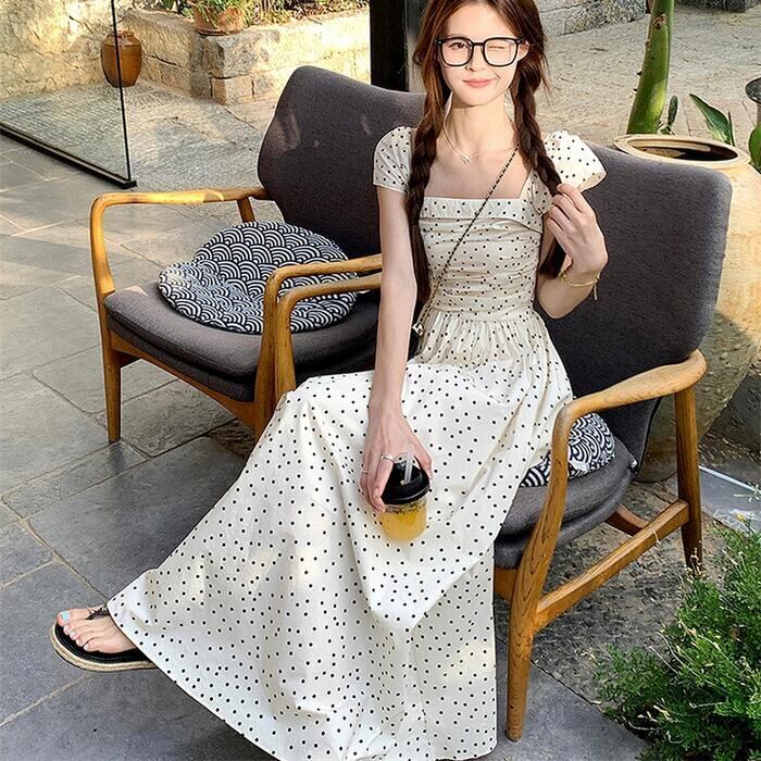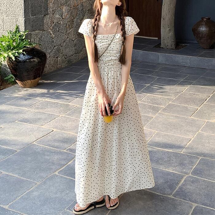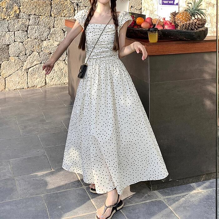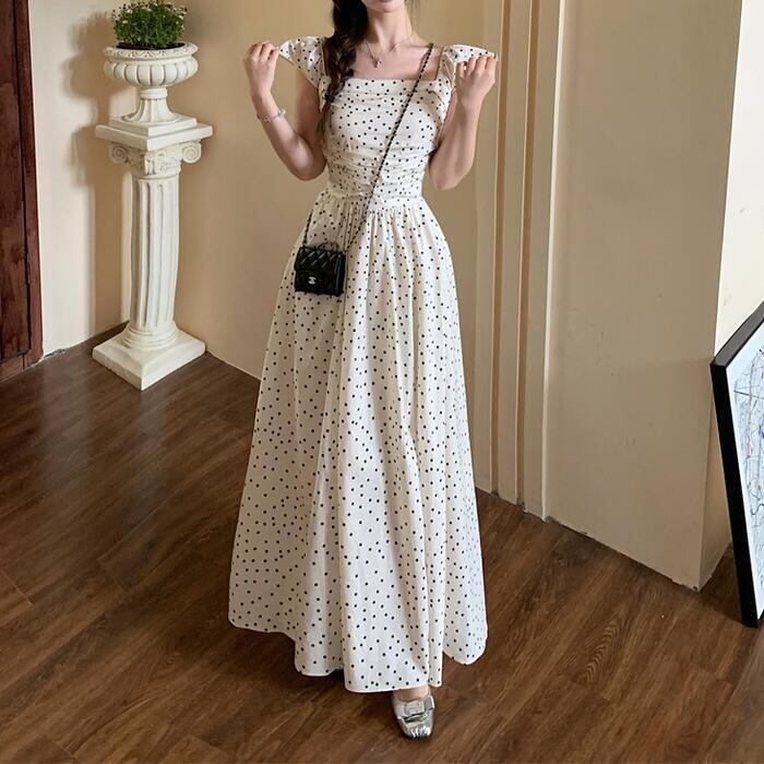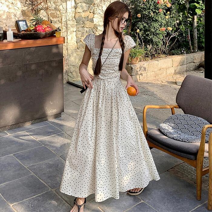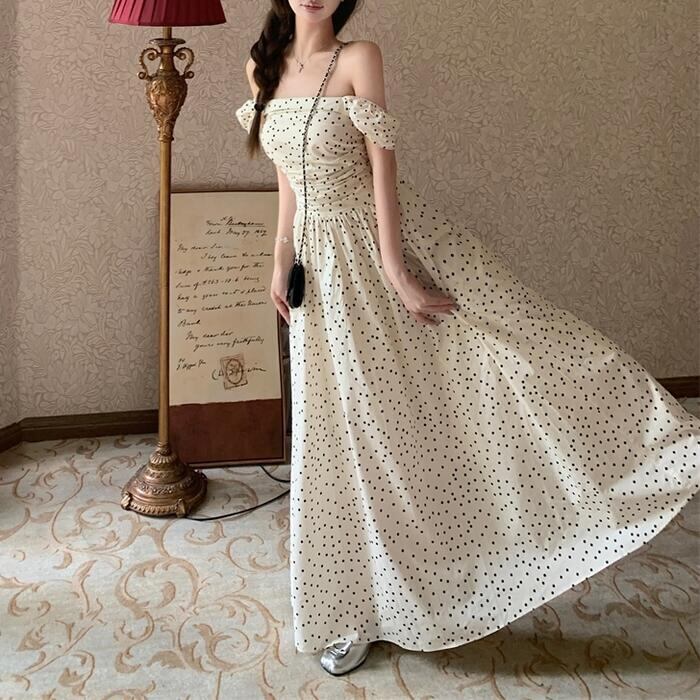 大きいサイズ ワンピース ワンピ ドレス 袖あり ドット 水玉 レディース エレガント きれいめ カジュアル 半袖 大人 可愛い オフショルダー フェミニン Aライン ロング丈 シャーリング スクエアネック 体型カバー ベージュ 春 秋 夏 20代 30代 40代 50代