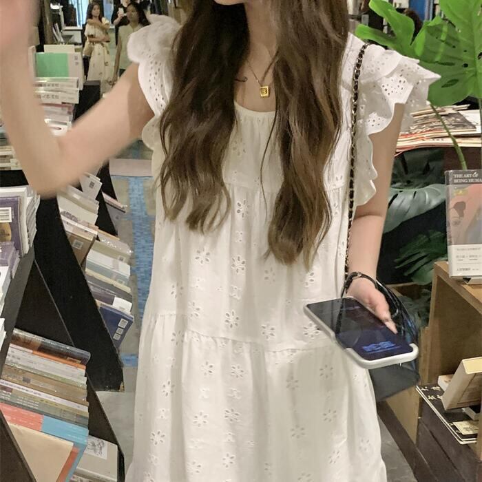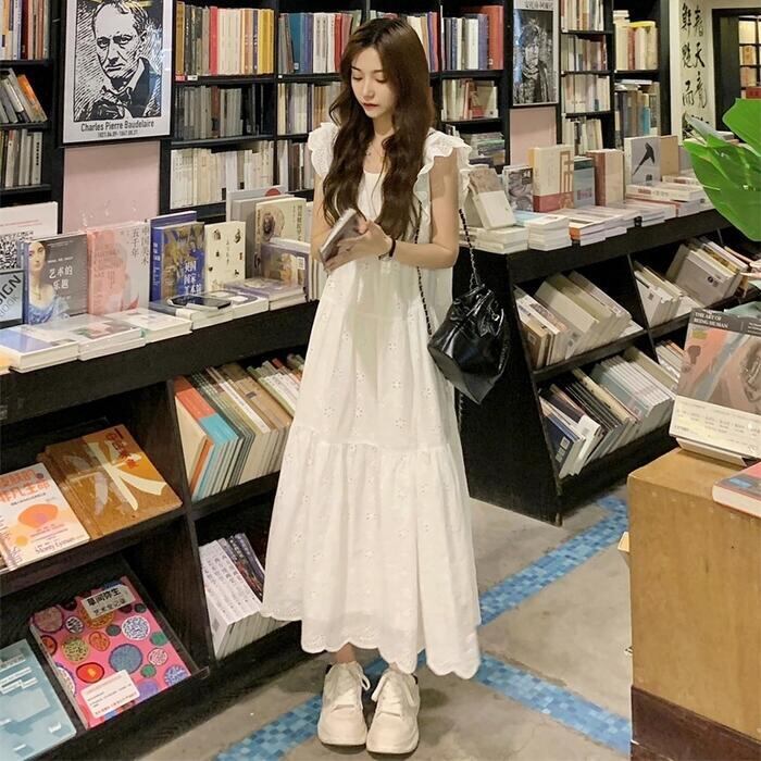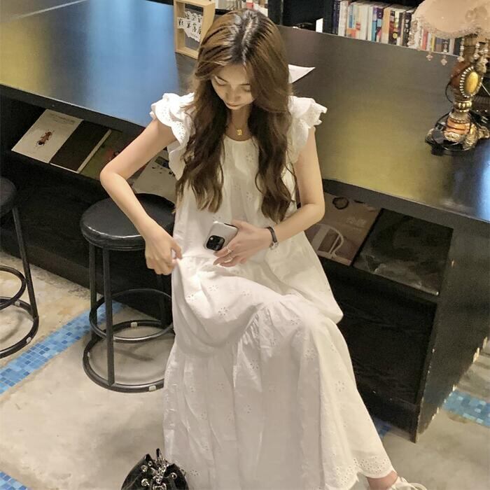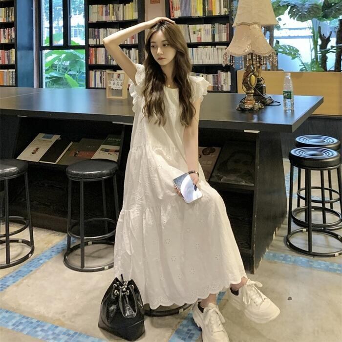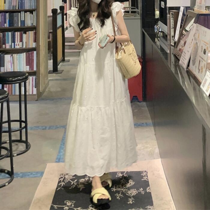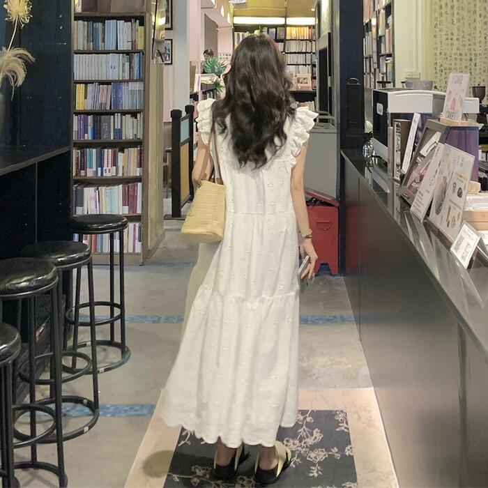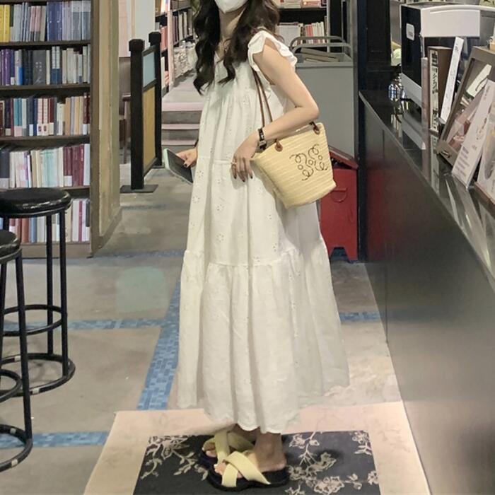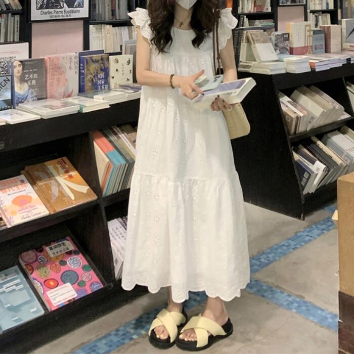 ワンピース ワンピ ドレス レース レディース エレガント きれいめ カジュアル 半袖 フリル ノースリーブ 大人 可愛い フェミニン Aライン ロング丈 ナチュラル ゆったり リラックス 体型カバー ホワイト 白 春 秋 夏 20代 30代 40代 50代