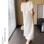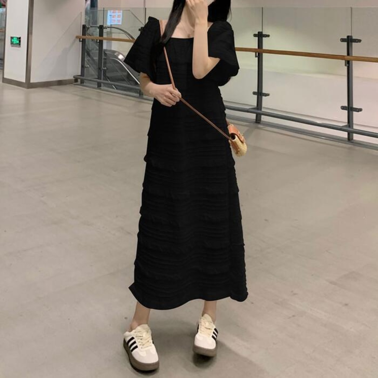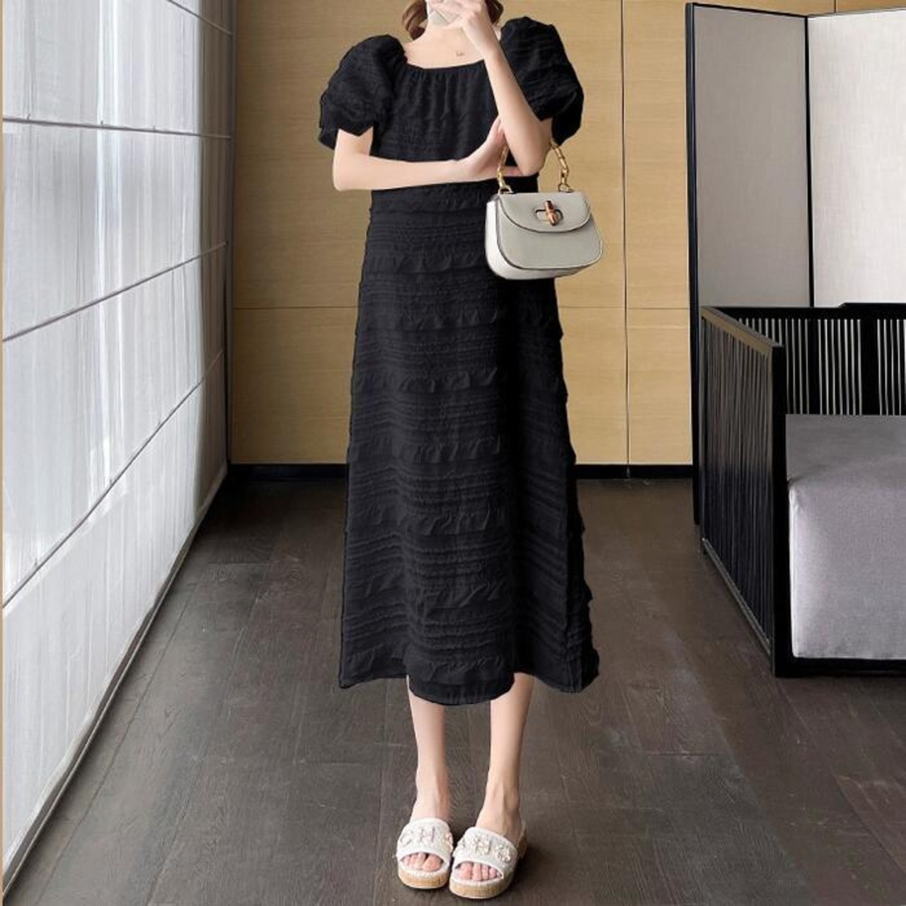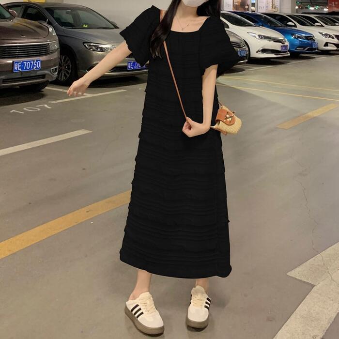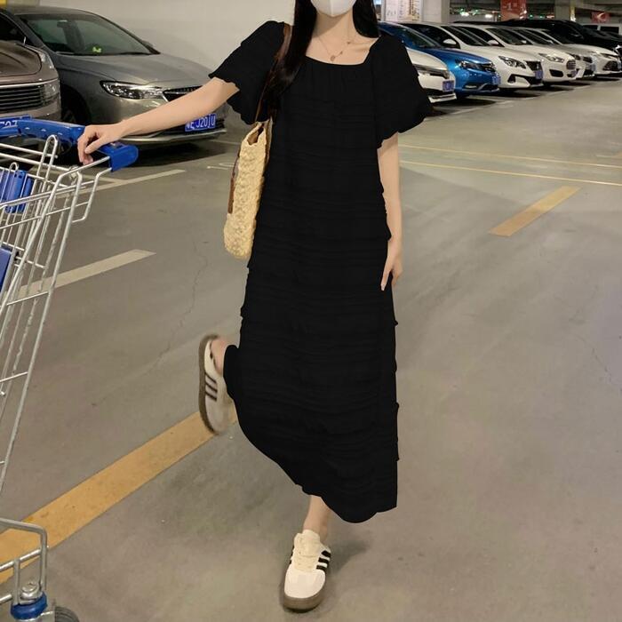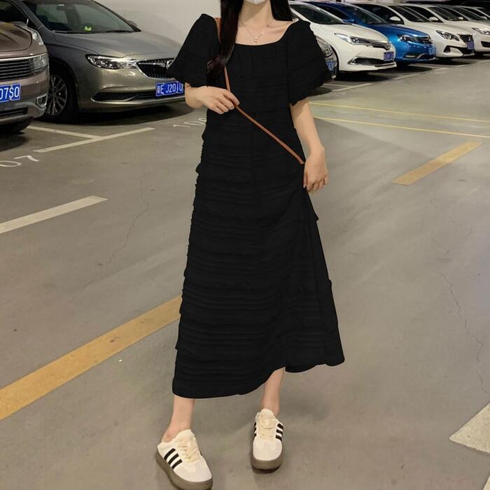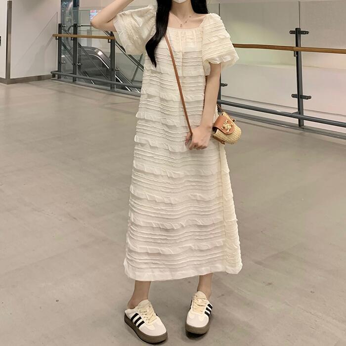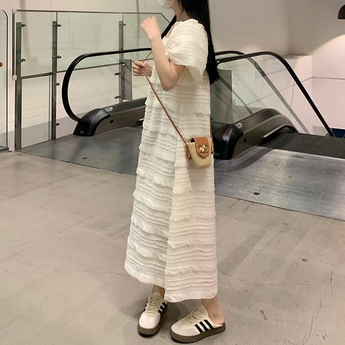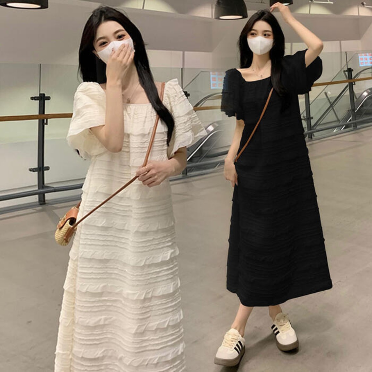 全2色 体型カバー 大きいサイズ ワンピース ワンピ ドレス フリル レディース エレガント きれいめ カジュアル 半袖 大人 可愛い フェミニン Aライン ロング丈 ナチュラル スクエアネック オフショルダー ゆったり リラックス ブラック 黒 ホワイト 白 春 秋 夏 20代 30代 40代 50代