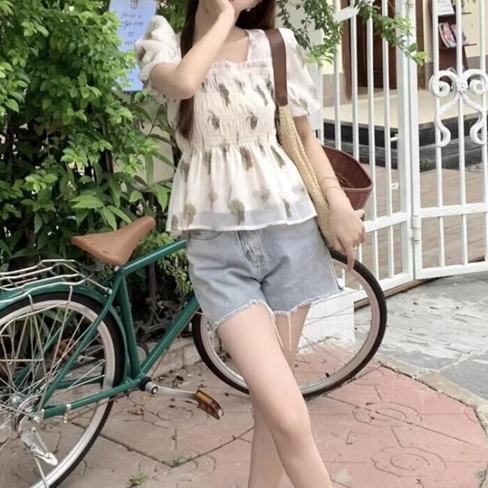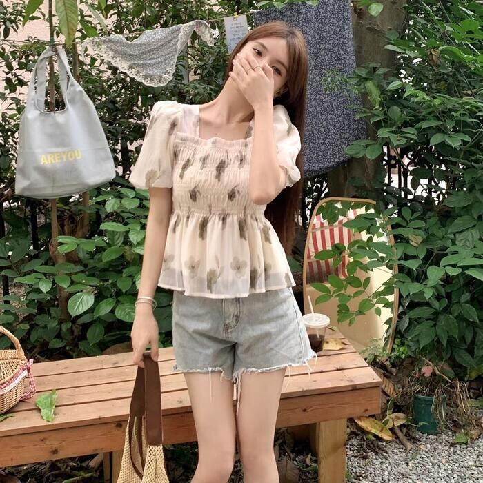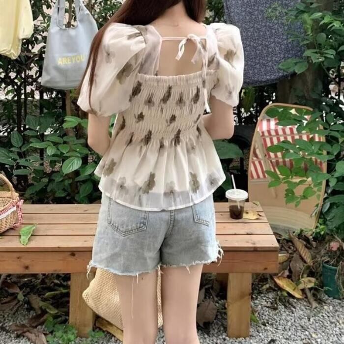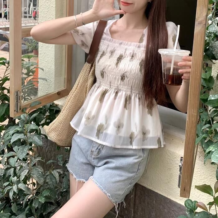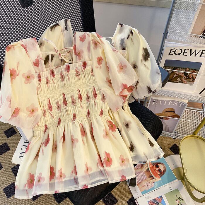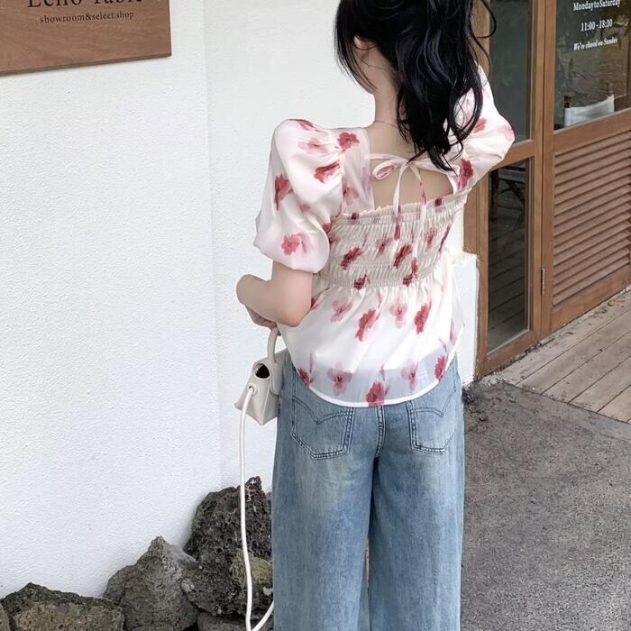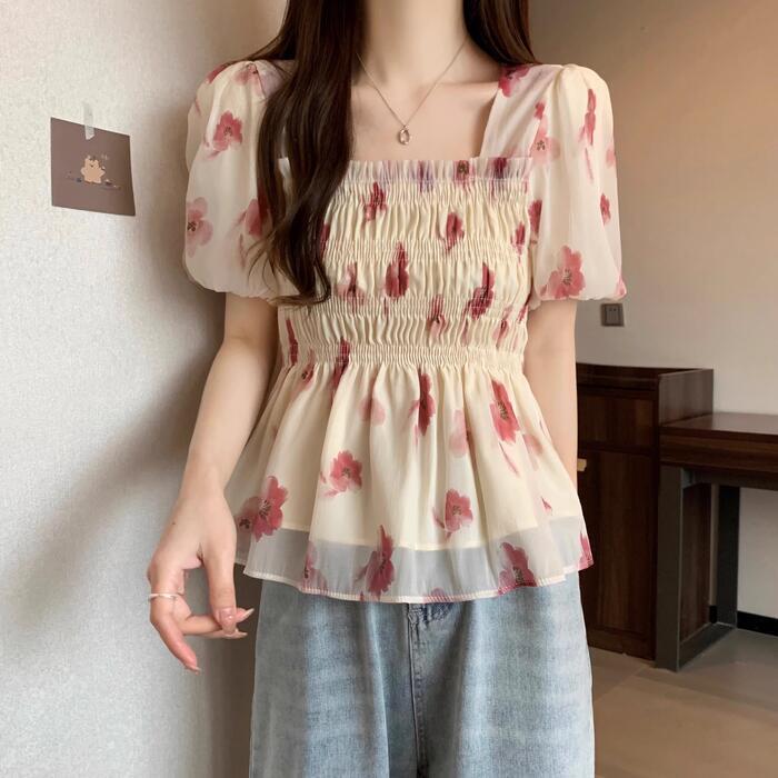 シックなフラワープリントのシャーリングシフォントップス。