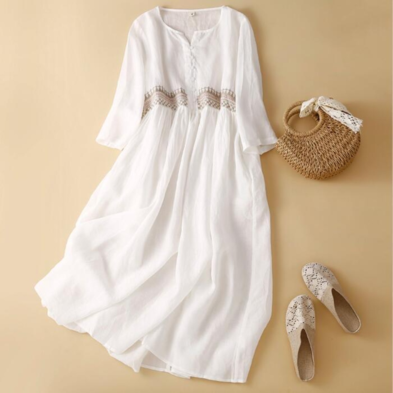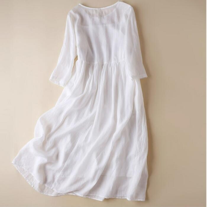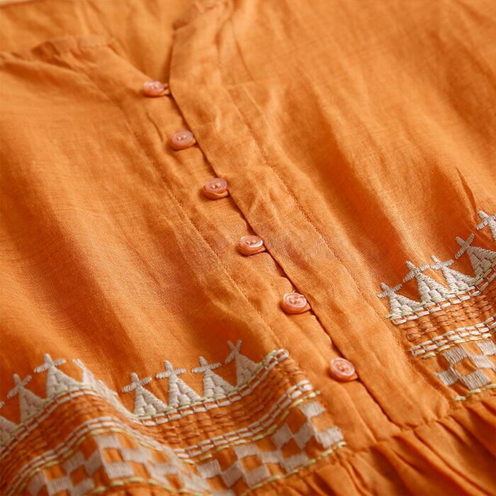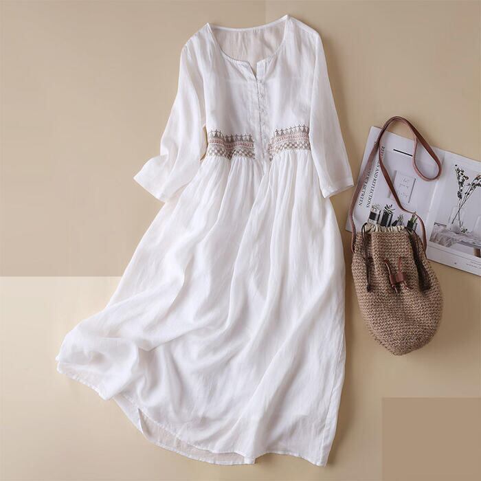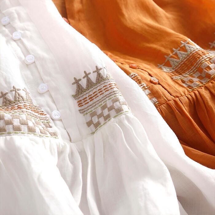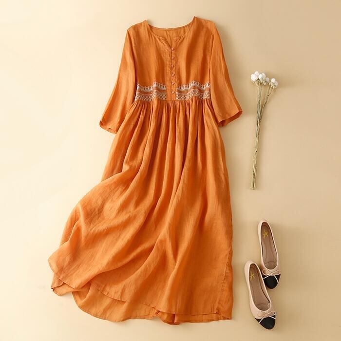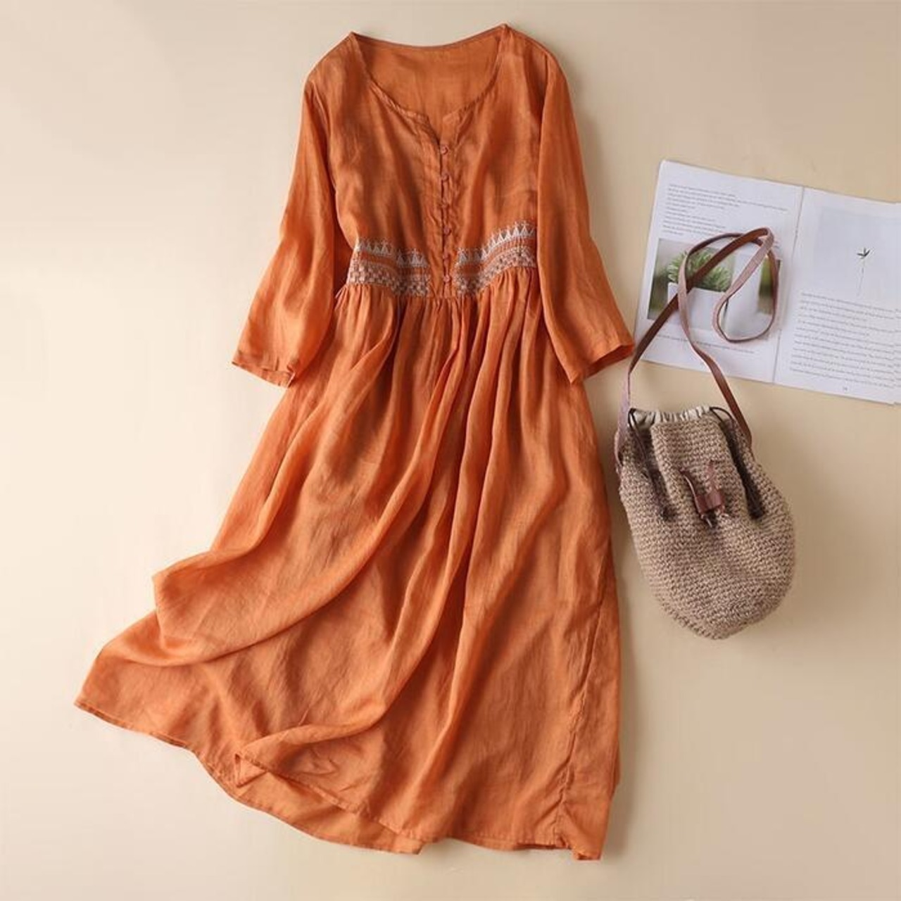 全2色 大きいサイズ ワンピース ワンピ ドレス 袖あり 刺繍 レディース エレガント きれいめ カジュアル 九分袖 大人 可愛い フェミニン ミモレ丈 コットン オリエンタル ナチュラル 涼しい リゾート ゆったり 楽ちん オレンジ ホワイト 白 春 秋 夏 20代 30代 40代 50代