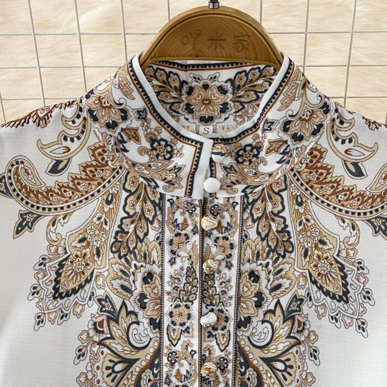 クラシカルなプリント柄が新鮮なスタンドカラーワンピース。