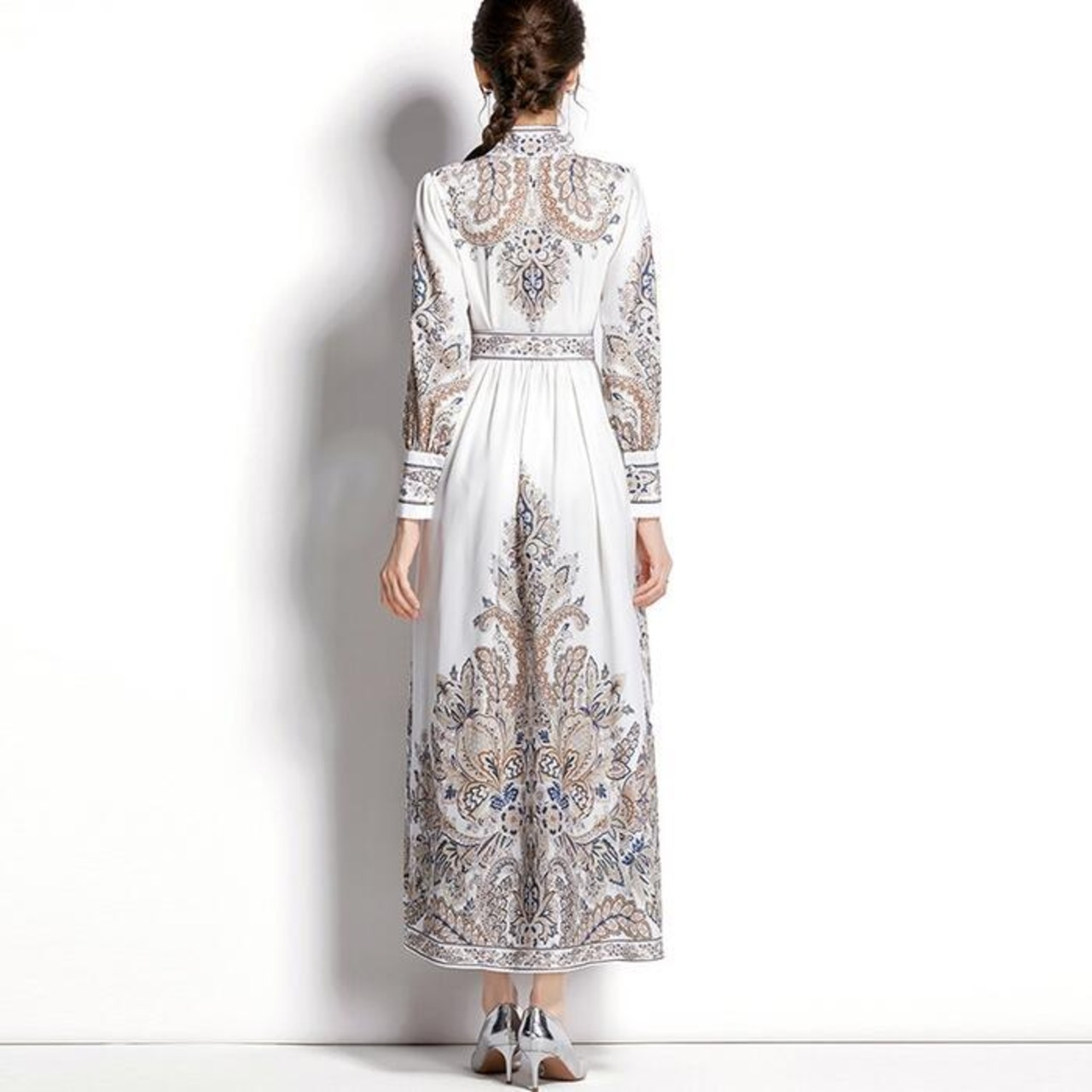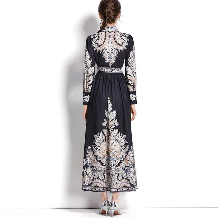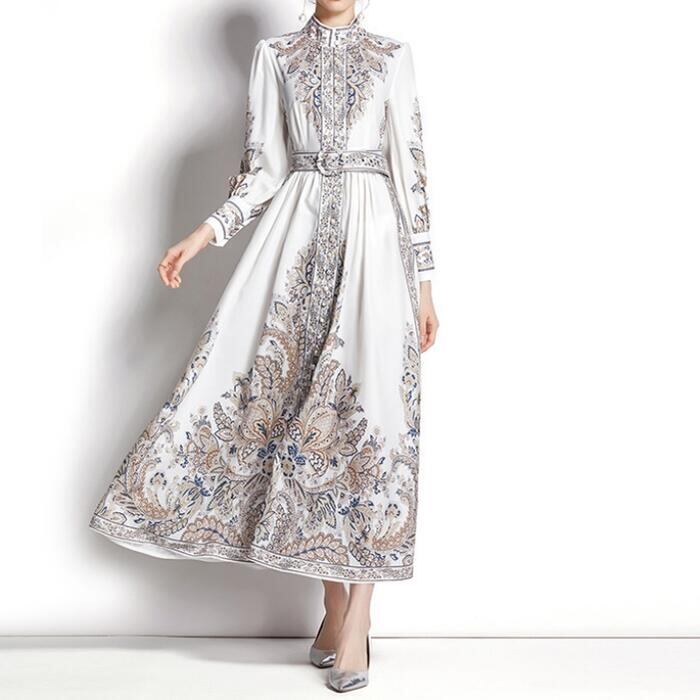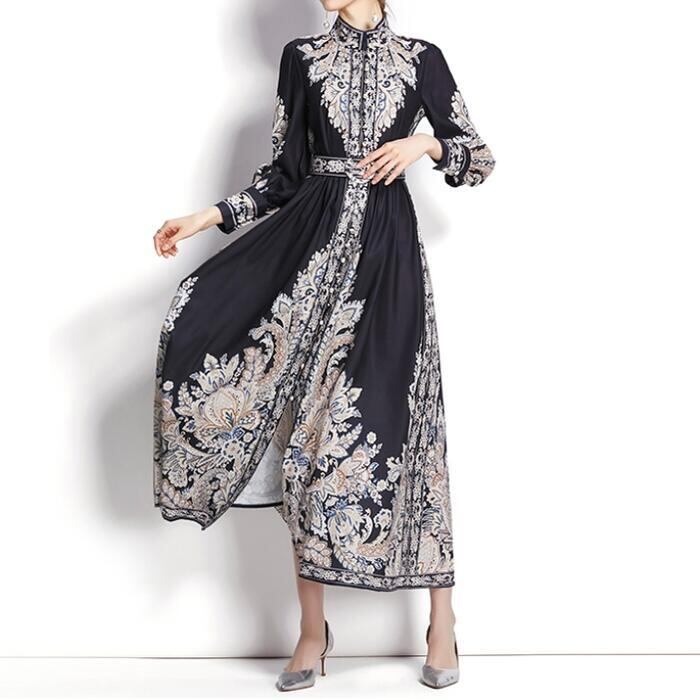 全2色 大きいサイズ ワンピース ワンピ ドレス 袖あり レディース エレガント きれいめ カジュアル 長袖 大人 可愛い フェミニン ロング丈 クラシカル ウエストベルト スタンドカラー プリント ブラック 黒 ホワイト 白 春 秋 夏 20代 30代 40代 50代
