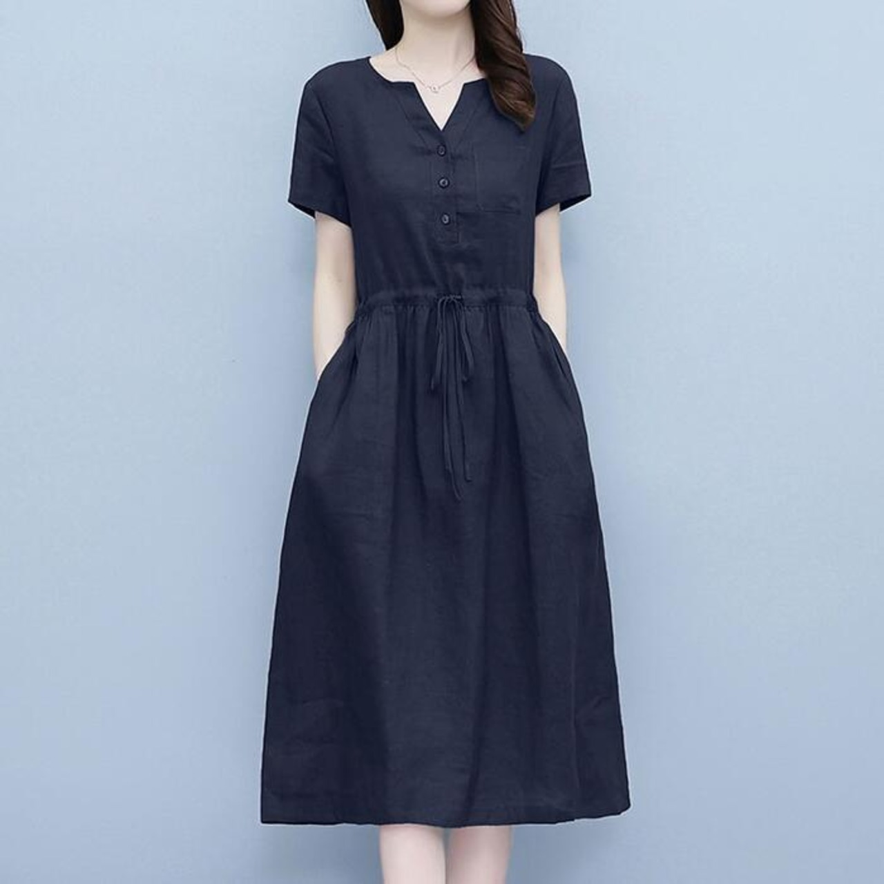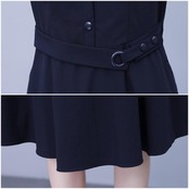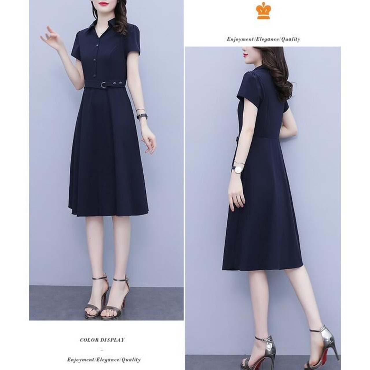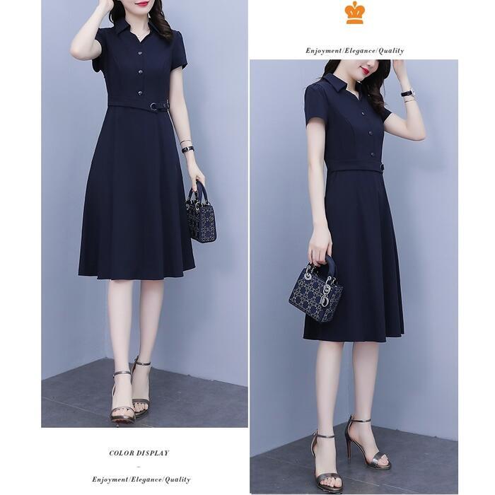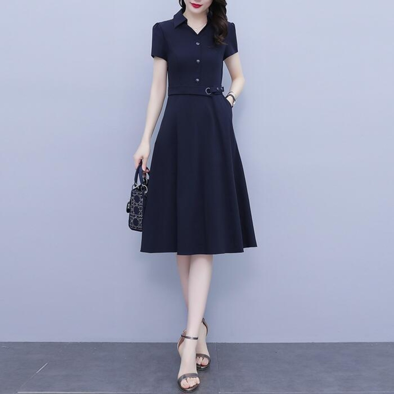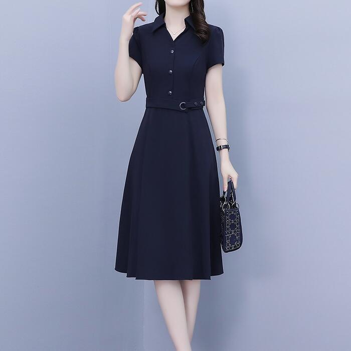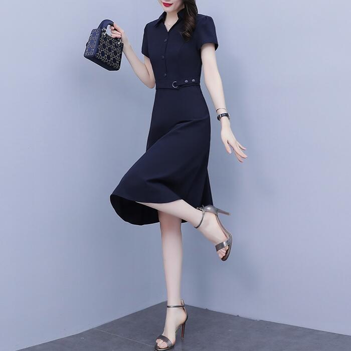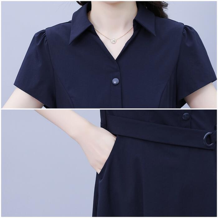 大きいサイズ ワンピース ワンピ ドレス 袖あり シャツワンピ レディース エレガント きれいめ カジュアル 半袖 大人 可愛い フェミニン ひざ丈 ミディ丈 シンプル ウエストベルト 体型カバー 通勤 Vネック ネイビー 春 秋 夏 20代 30代 40代 50代