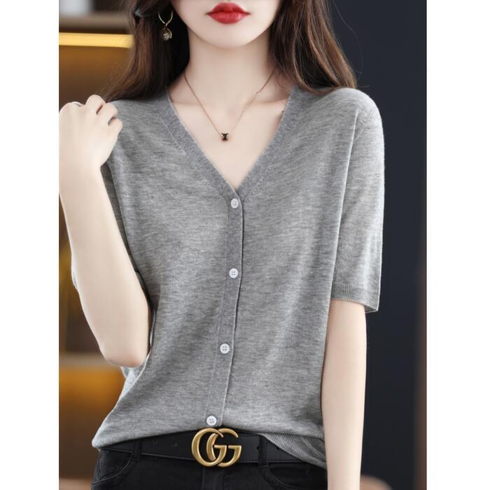 全6色 大きいサイズ シンプル ニット トップス カーディガン カットソー プルオーバー シルク レディース エレガント きれいめ カジュアル フェミニン 大人 可愛い Vネック 五分袖 ベーシック イエロー ベージュ パープル ブルー 青 ブラック 黒 グレー 春 秋 夏 20代 30代 40代 50代