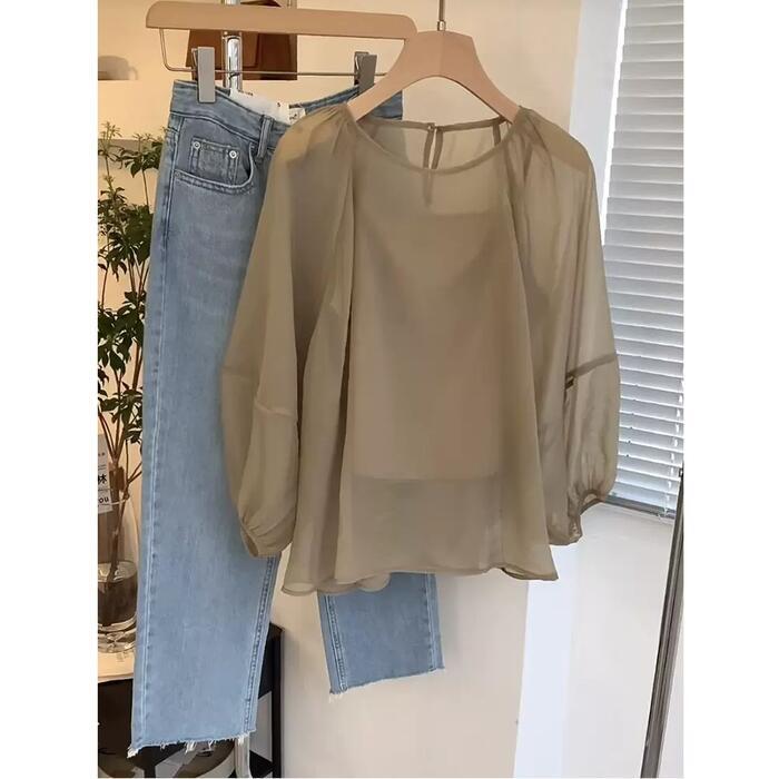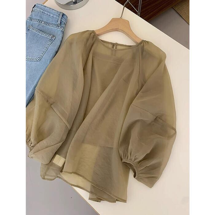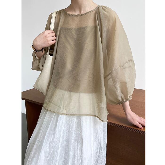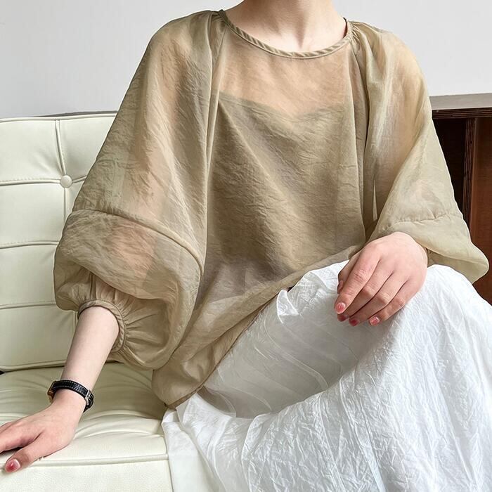 大きいサイズ レイヤード シンプル パフスリーブ トップス シャツ ブラウス プルオーバー シアー Tシャツ 2点セット キャミソール レディース 九分袖 エレガント きれいめ カジュアル フェミニン 大人 可愛い 透け感 体型カバー ゆったり ベージュ 春 秋 夏 20代 30代 40代 50代