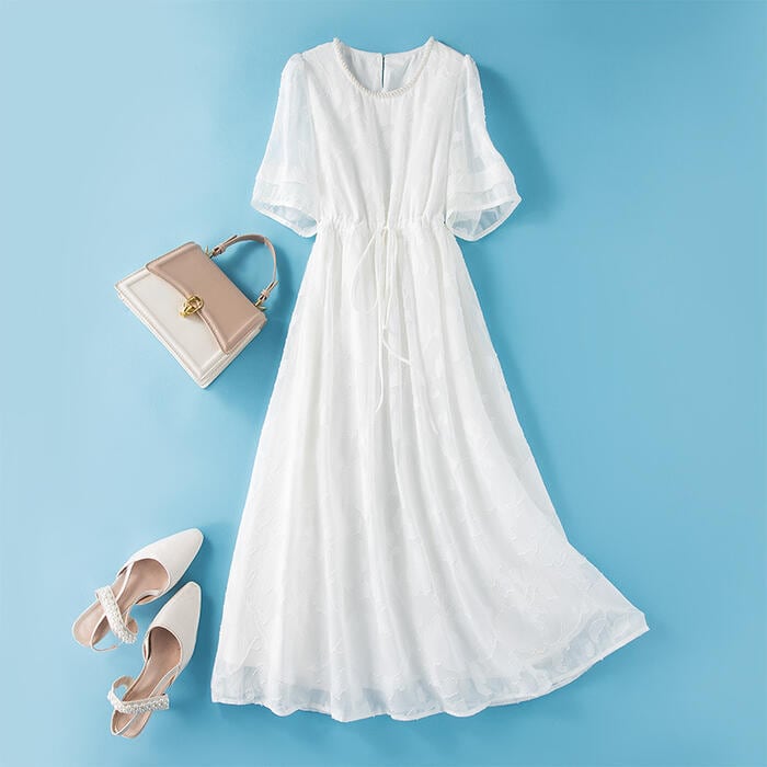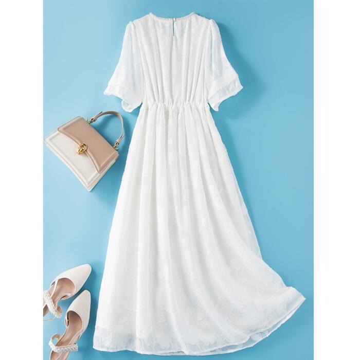 大きいサイズ ワンピース ワンピ ドレス 袖あり ビジュー レディース ジャガード エレガント きれいめ カジュアル 半袖 大人 可愛い フェミニン Aライン ドロスト ロング丈 体型カバー お呼ばれ ホワイト 白 春 秋 夏 20代 30代 40代 50代