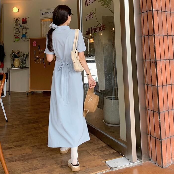 全3色 大きいサイズ 体型カバー ワンピース ワンピ ドレス シャツワンピ 袖あり レディース プリーツ エレガント きれいめ カジュアル 大人 可愛い フェミニン Aライン ロング丈 ウエストリボン パープル ブルー 青 ブラック 黒 春 秋 夏 20代 30代 40代 50代