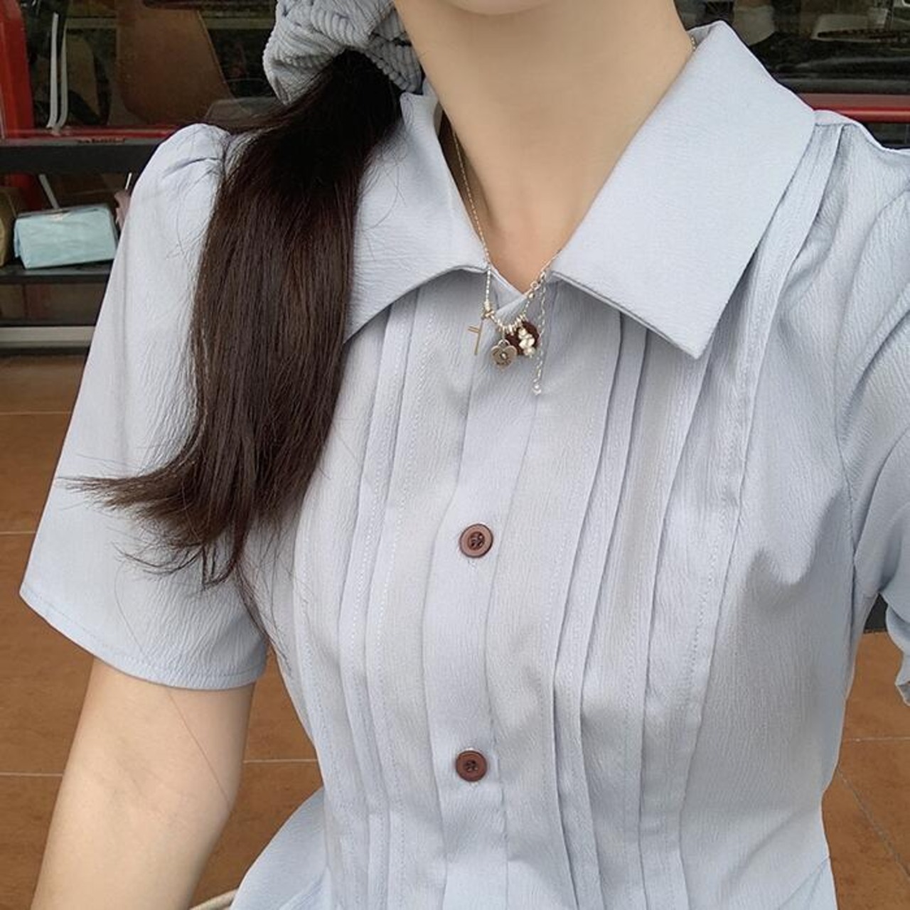 襟付きデザインがフォーマルな大人の女性らしい印象を演出。