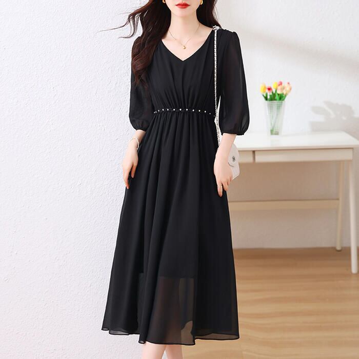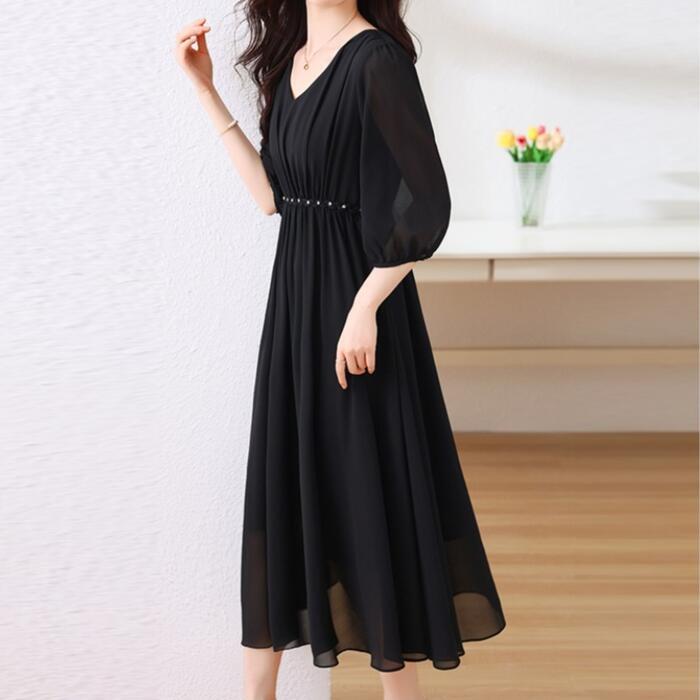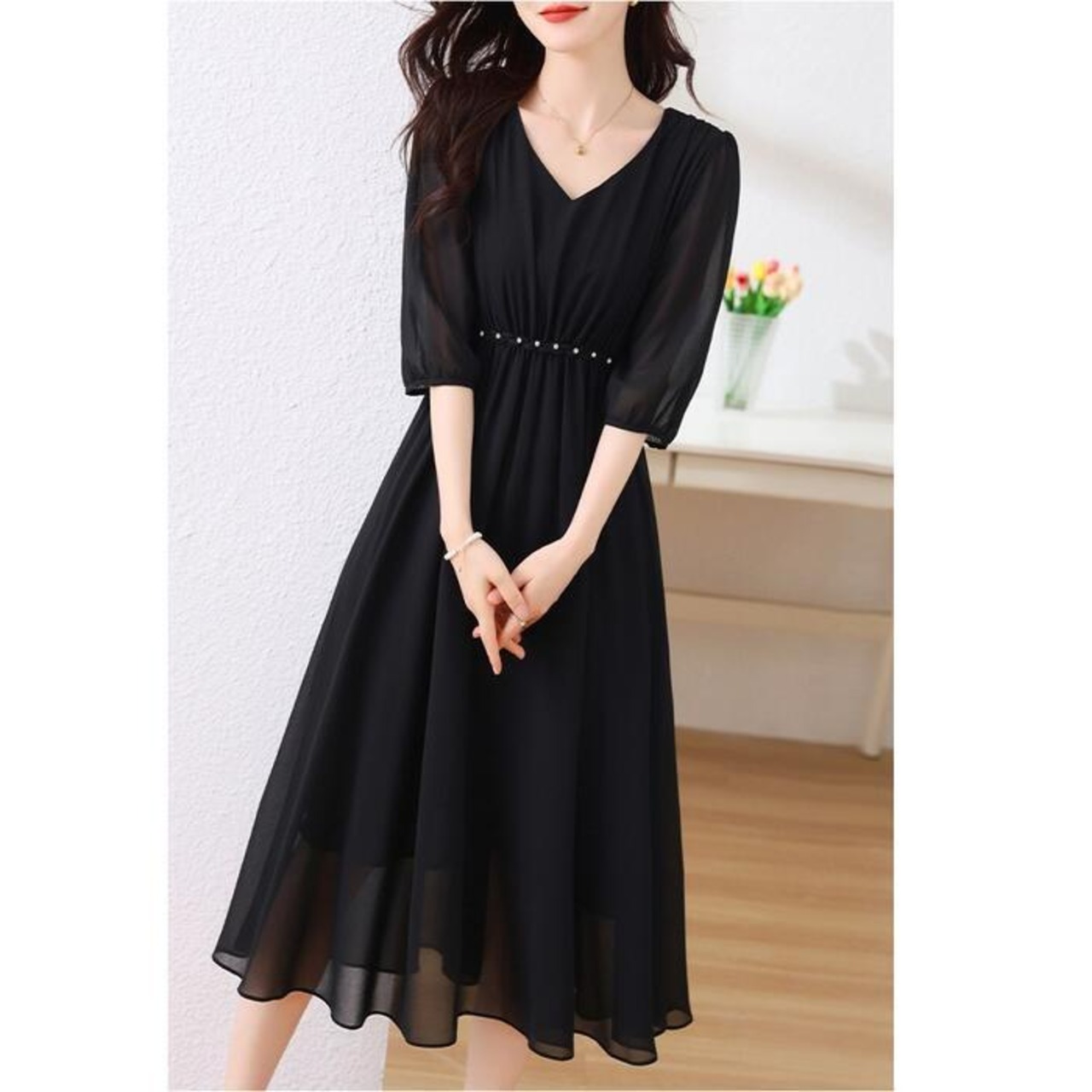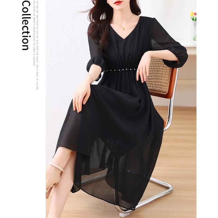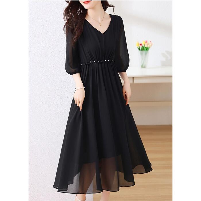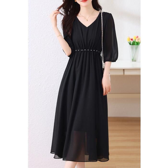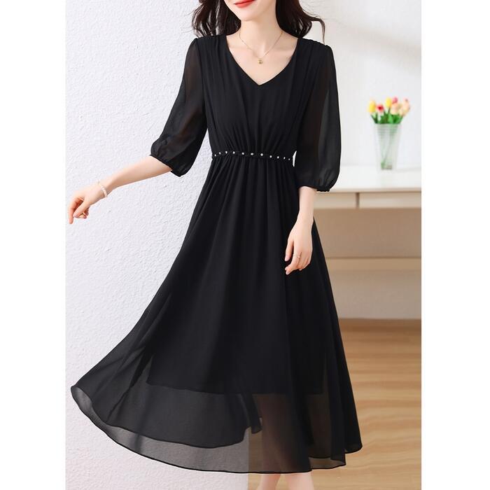 上品な透け感が魅力の七分袖シフォンワンピース。