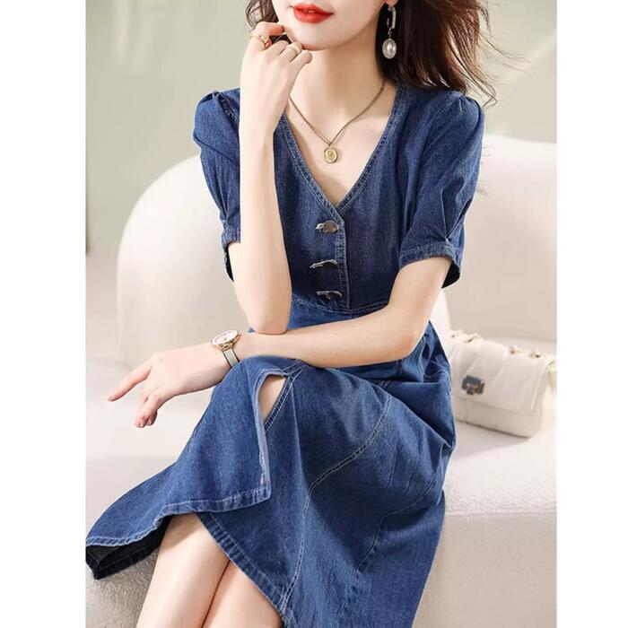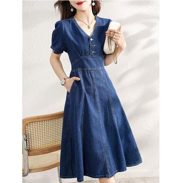 体型カバー 大きいサイズ ワンピース ワンピ ドレス レディース 袖あり デニム エレガント きれいめ カジュアル 大人 可愛い フェミニン Aライン 半袖 ミモレ丈 ハイウエスト 切り替え シンプル Vネック スリット ネイビー 春 秋 夏 20代 30代 40代 50代