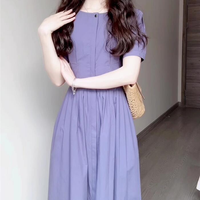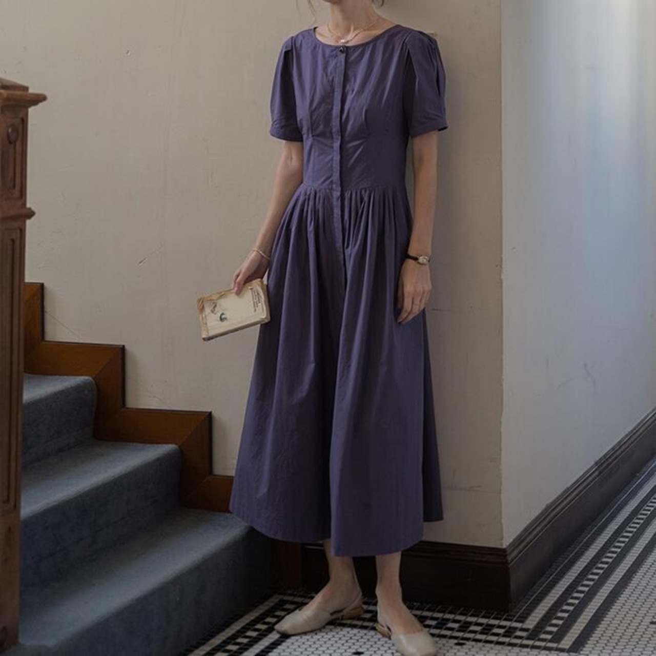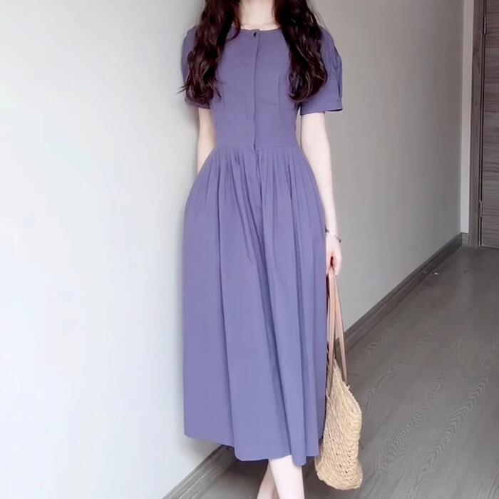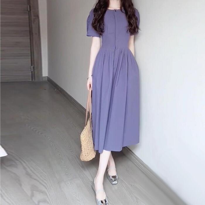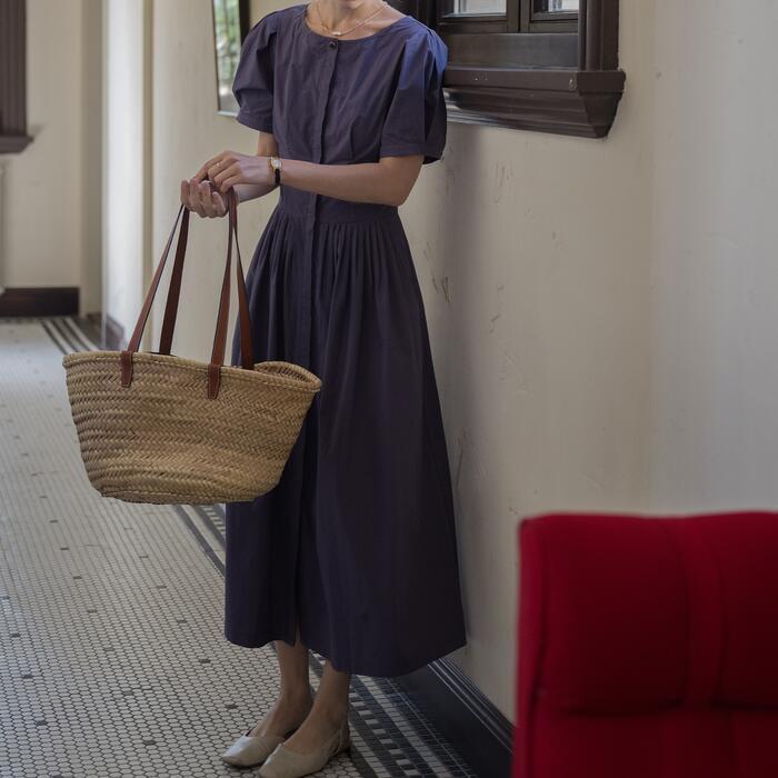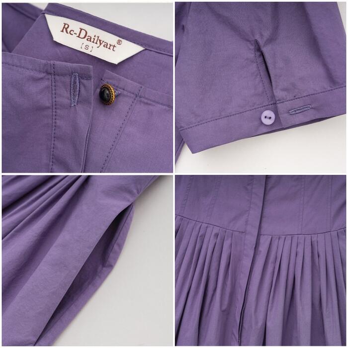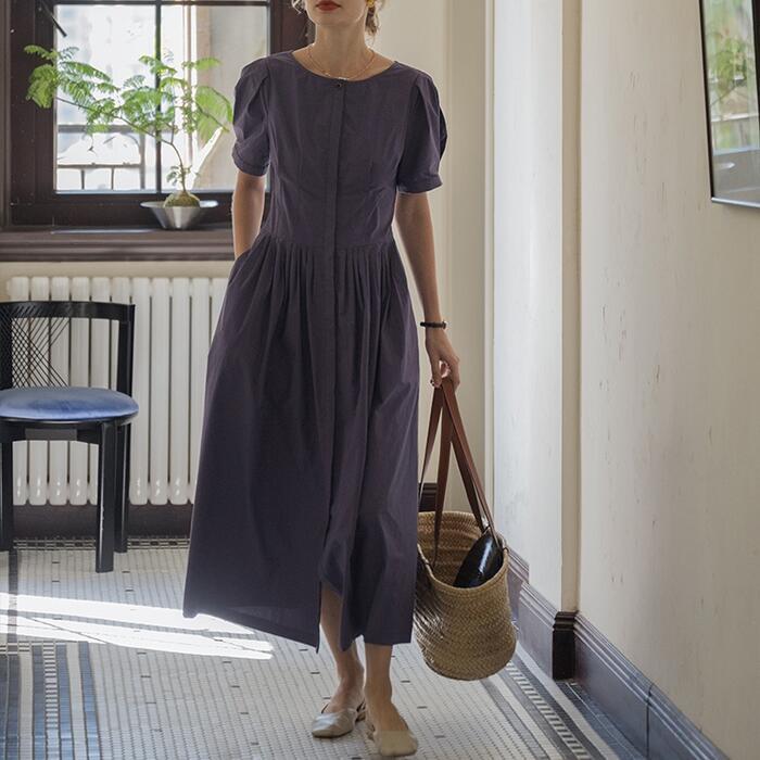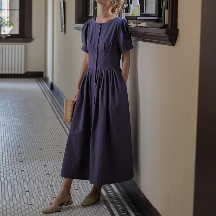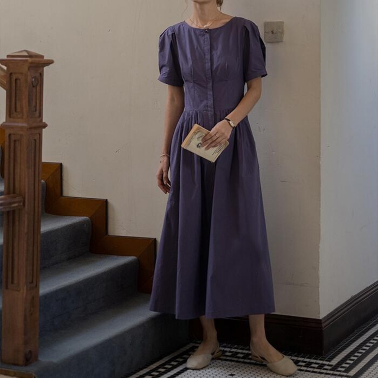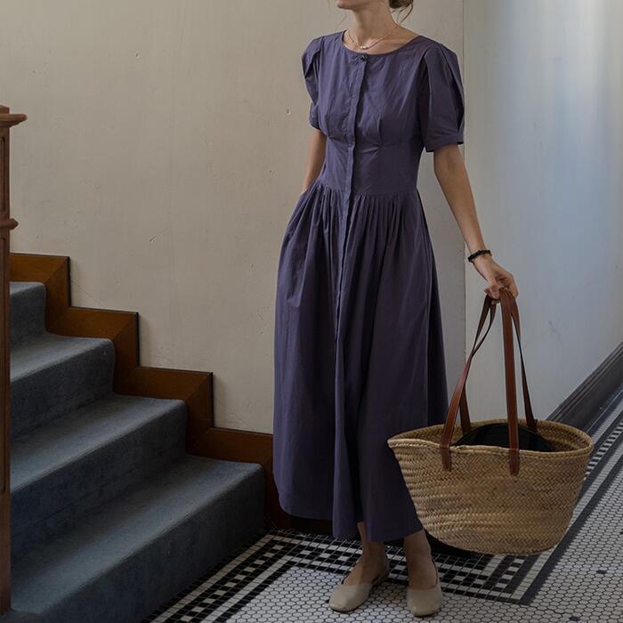 上品可愛い落ち着いたパープルカラーのパフスリーブワンピース。