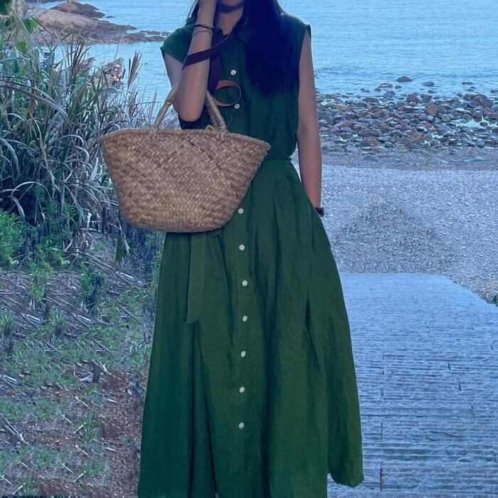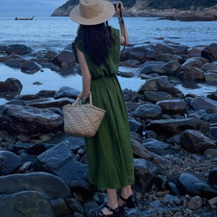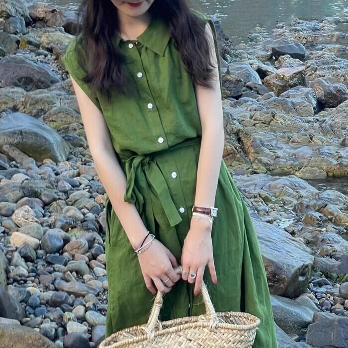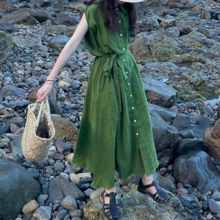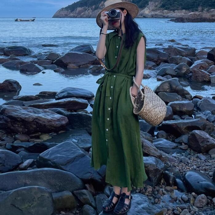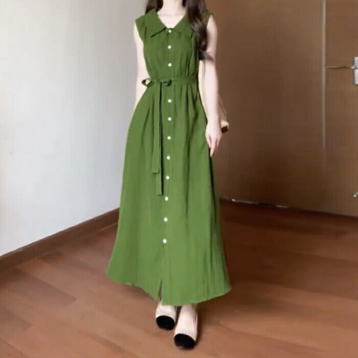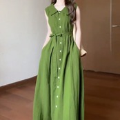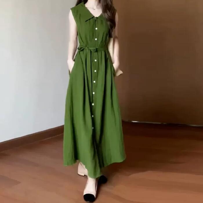 体型カバー 大きいサイズ ワンピース ワンピ ドレス レディース ビッグカラー エレガント きれいめ カジュアル 大人 可愛い フェミニン Aライン ロング丈 ウエストリボン シンプル 上品 ナチュラル ノースリーブ リゾート グリーン 緑 春 秋 夏 20代 30代 40代 50代