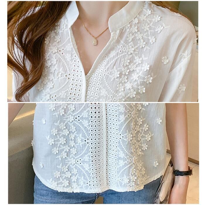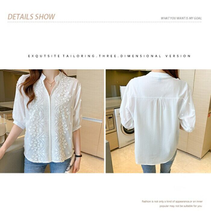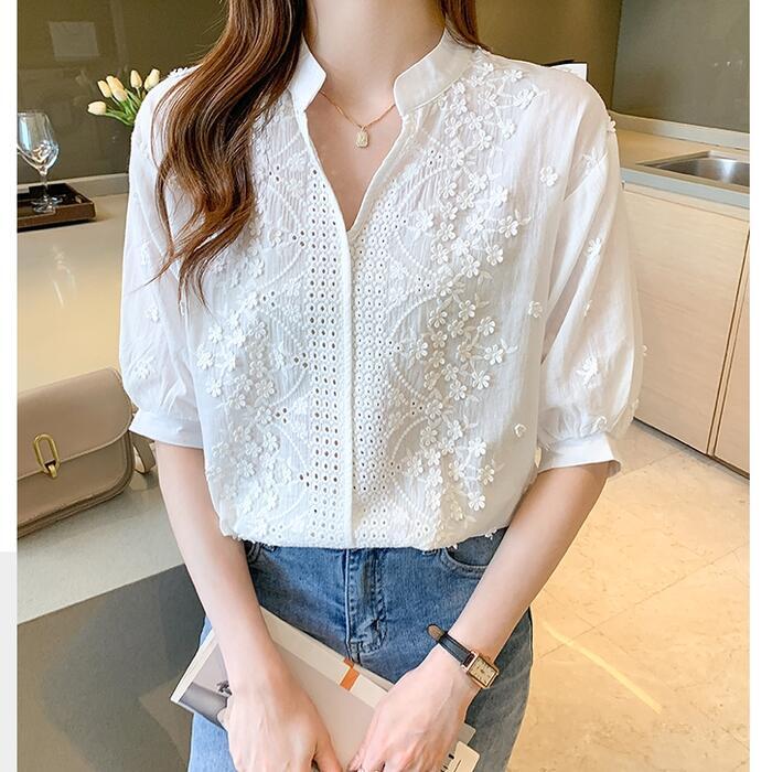 大きいサイズ トップス シャツ ブラウス レース 花柄 プルオーバー レディース 五分袖 エレガント きれいめ カジュアル フェミニン 大人 可愛い Vネック 体型カバー 通勤 オフィス ナチュラル ゆったり ホワイト 白 春 秋 夏 20代 30代 40代 50代