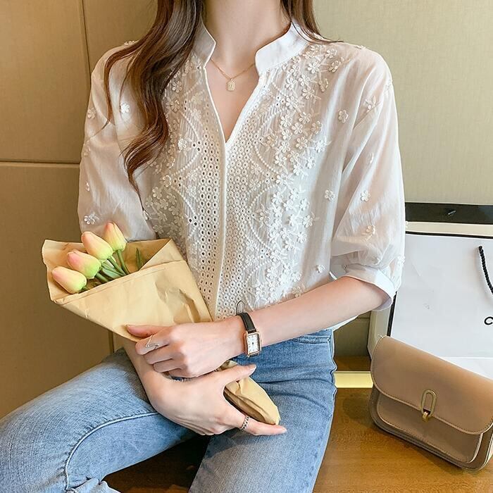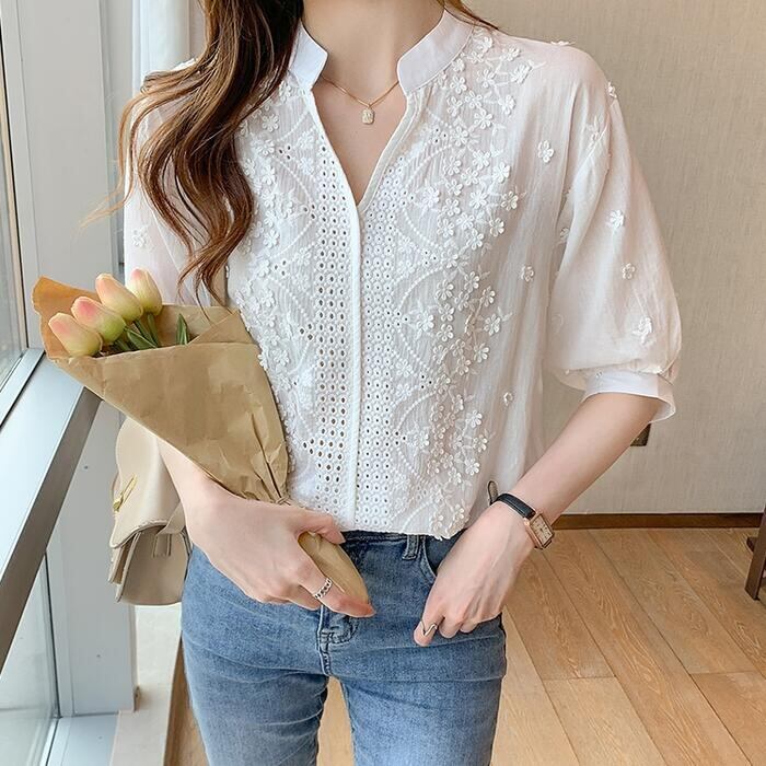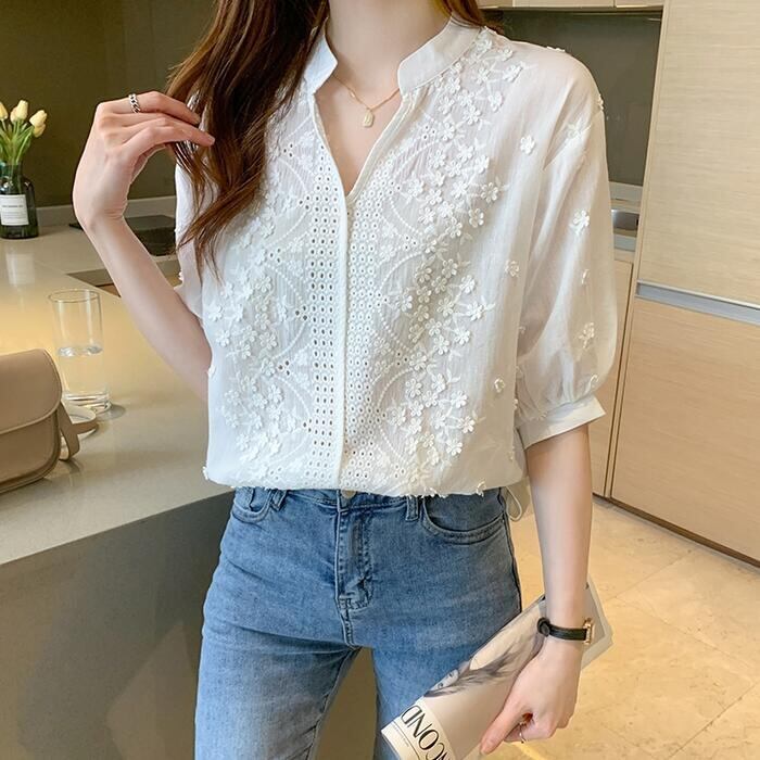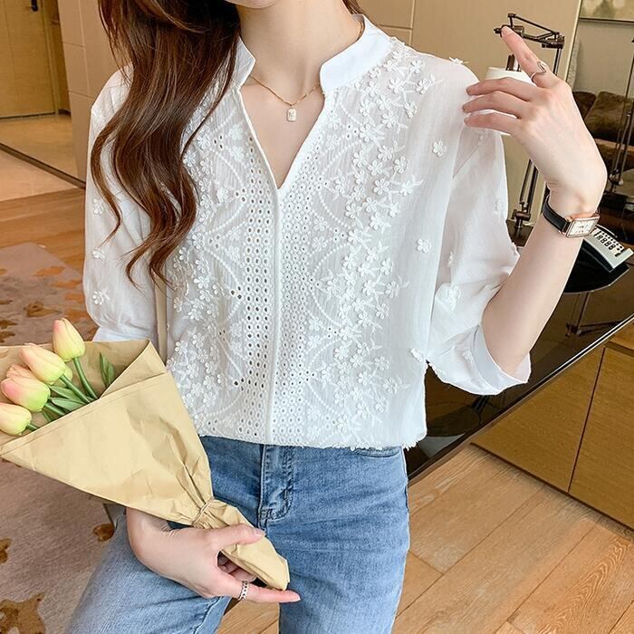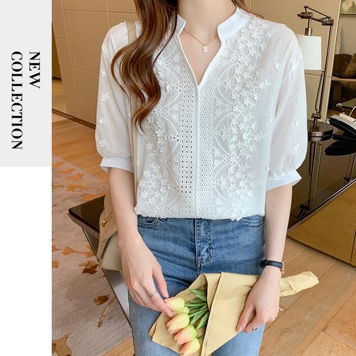 立体感のある花柄レースが可愛い五分袖ブラウス。