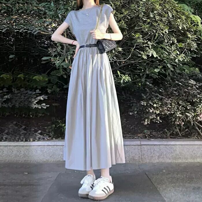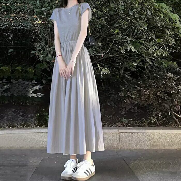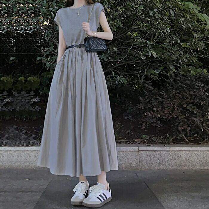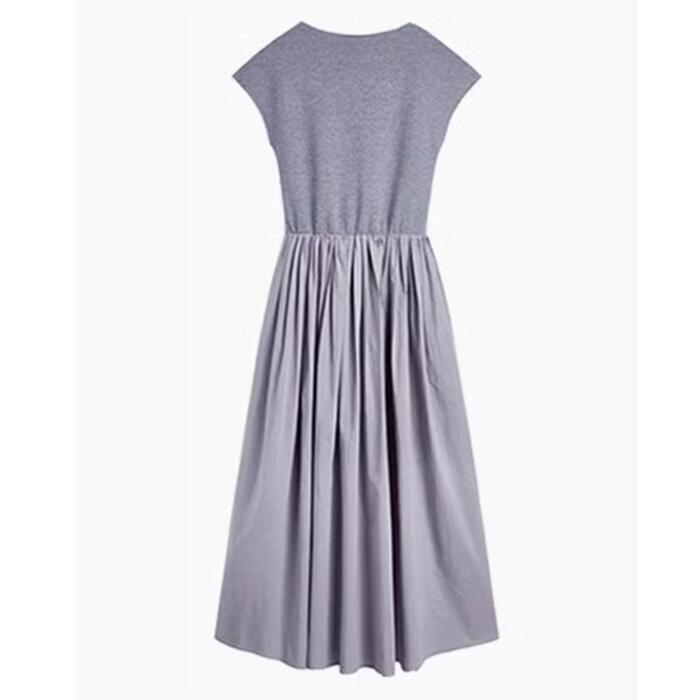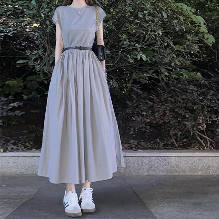 体型カバー 大きいサイズ ワンピース ワンピ ドレス 袖あり フレンチスリーブ レディース エレガント きれいめ カジュアル 大人 可愛い 半袖 フェミニン Aライン ミモレ丈 シンプル 切り替え ハイウエスト 上品 ナチュラル グレー 春 秋 夏 20代 30代 40代 50代