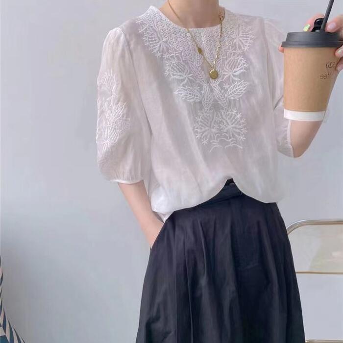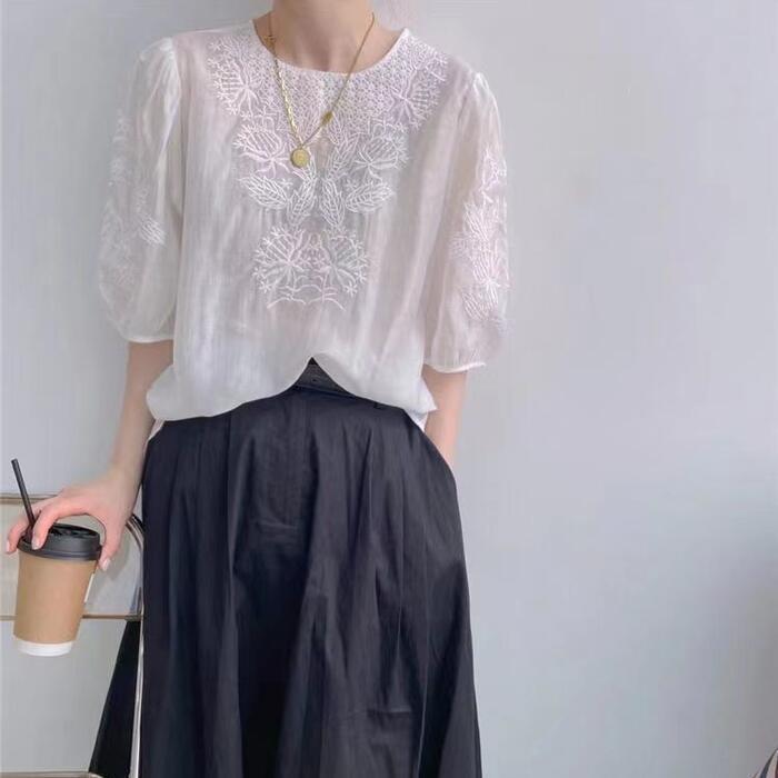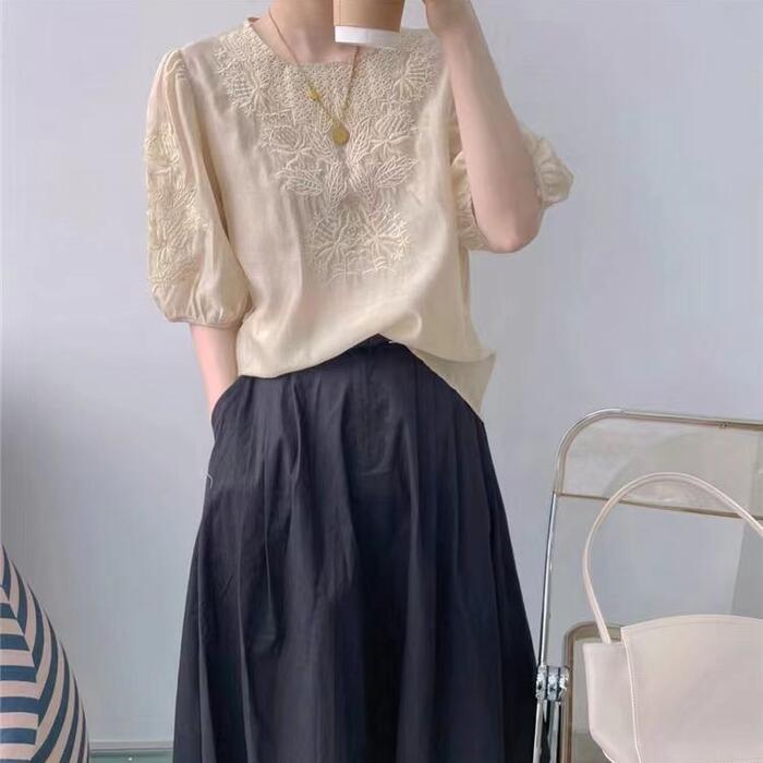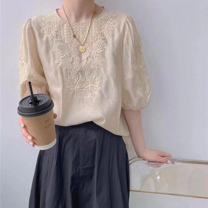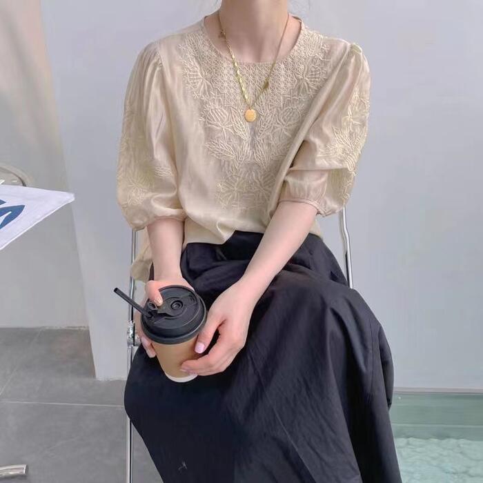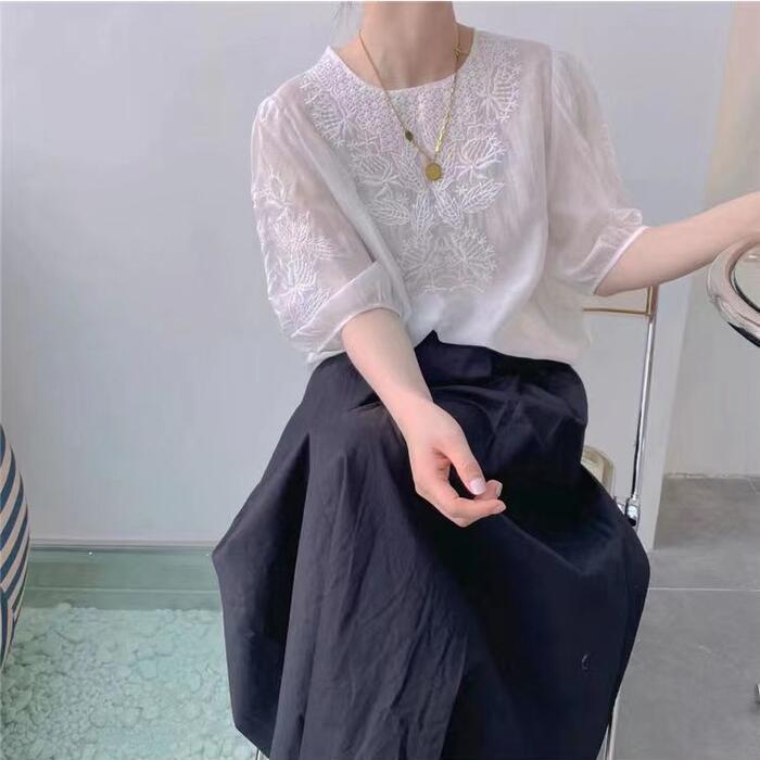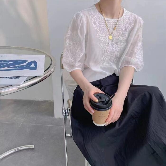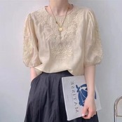 繊細な刺繍デザインが上品な五分袖ブラウス。