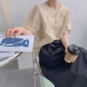 全2色 大きいサイズ パフスリーブ トップス シャツ ブラウス レース 花柄 プルオーバー 刺繍 レディース 五分袖 エレガント きれいめ カジュアル フェミニン 大人 可愛い 体型カバー 通勤 オフィス ナチュラル ゆったり ベージュ ホワイト 白 春 秋 夏 20代 30代 40代 50代