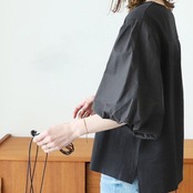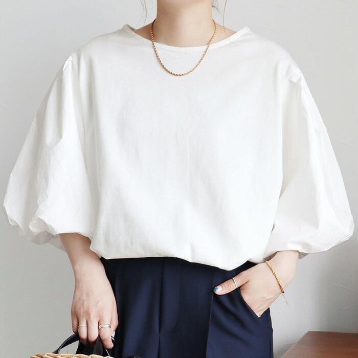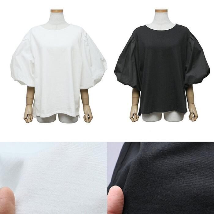 全2色 大きいサイズ 体型カバー シンプル パフスリーブ トップス シャツ ブラウス ボリュームスリーブ プルオーバー ランタンスリーブ レディース 五分袖 袖コンシャス エレガント きれいめ カジュアル フェミニン 大人 可愛い ナチュラル ブラック 黒 ホワイト 白 春 秋 夏 20代 30代 40代 50代