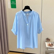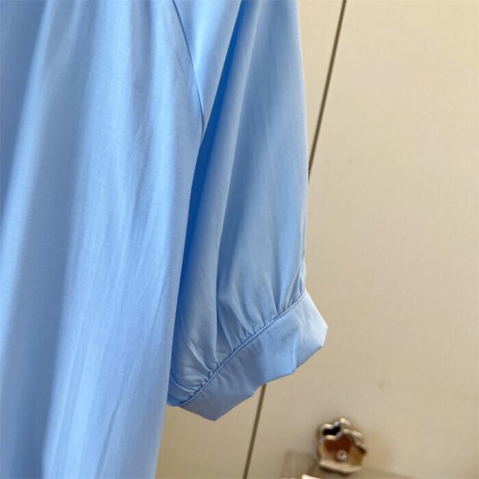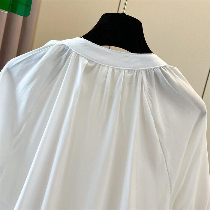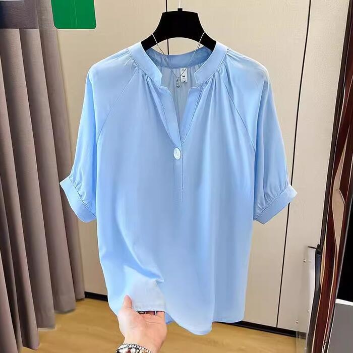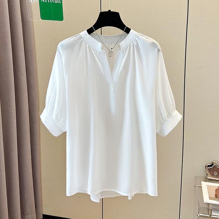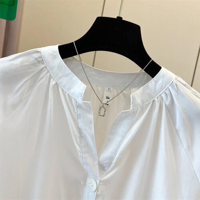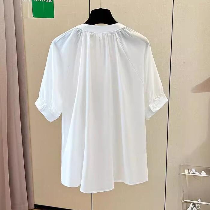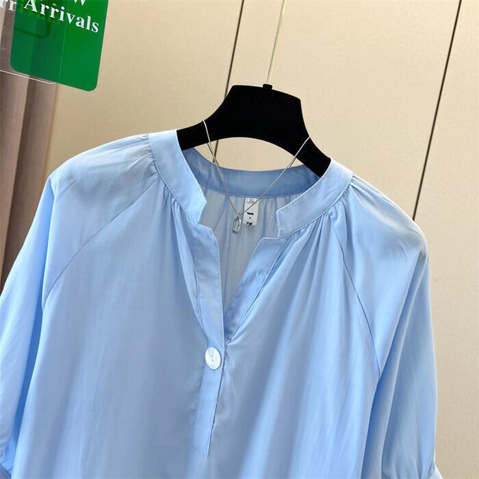 全2色 大きいサイズ 透け感 シンプル パフスリーブ トップス シャツ ブラウス Vネック プルオーバー ボタン レディース 半袖 エレガント きれいめ カジュアル フェミニン 大人 可愛い 体型カバー 通勤 オフィス ナチュラル ゆったり 青 ブルー ホワイト 白 春 秋 夏 20代 30代 40代 50代
