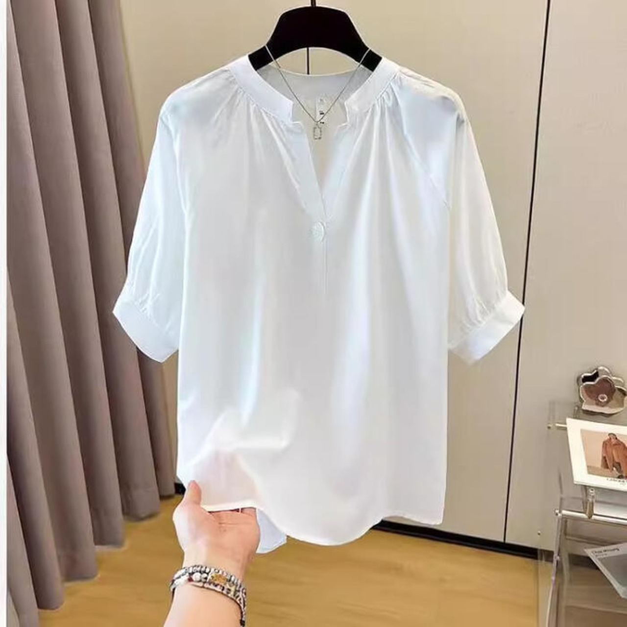 ワンボタンがアクセントになったVネックブラウス。