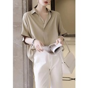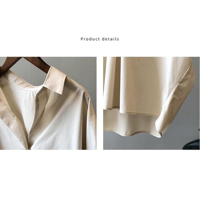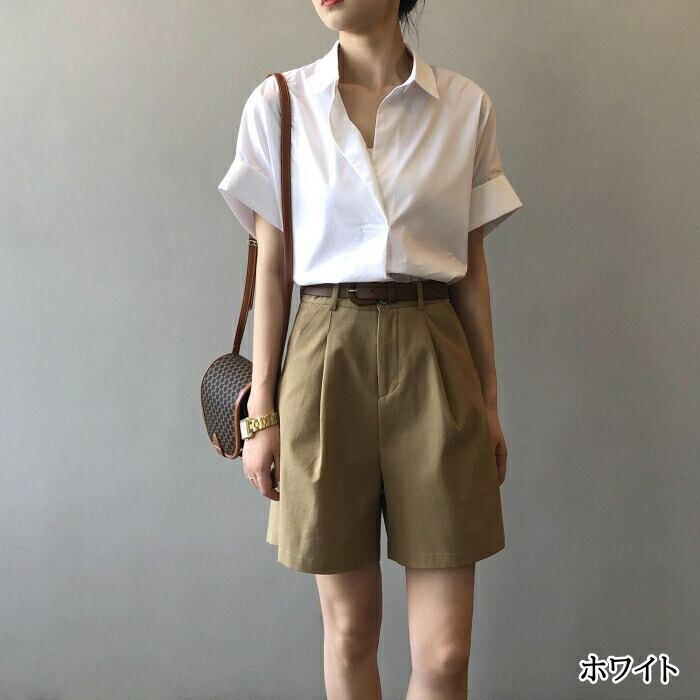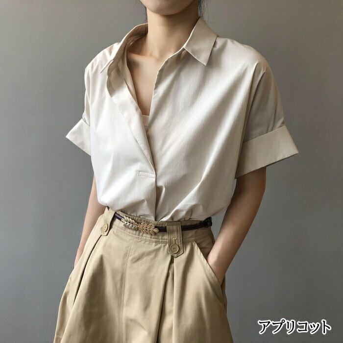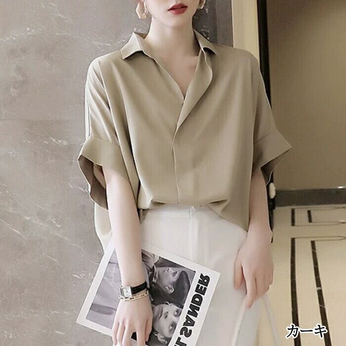 全4色 トップス スキッパー シャツ ブラウス Vネック プルオーバー レディース 半袖 エレガント きれいめ カジュアル フェミニン 大人 可愛い 体型カバー シンプル ナチュラル ゆったり ベージュ ブラック 黒 ホワイト 白 春 秋 夏 20代 30代 40代 50代