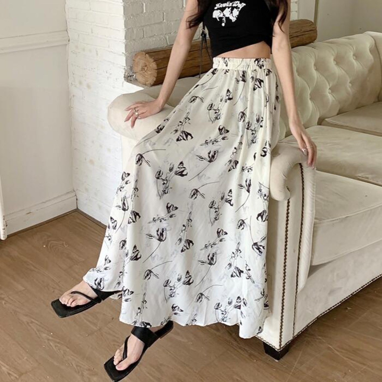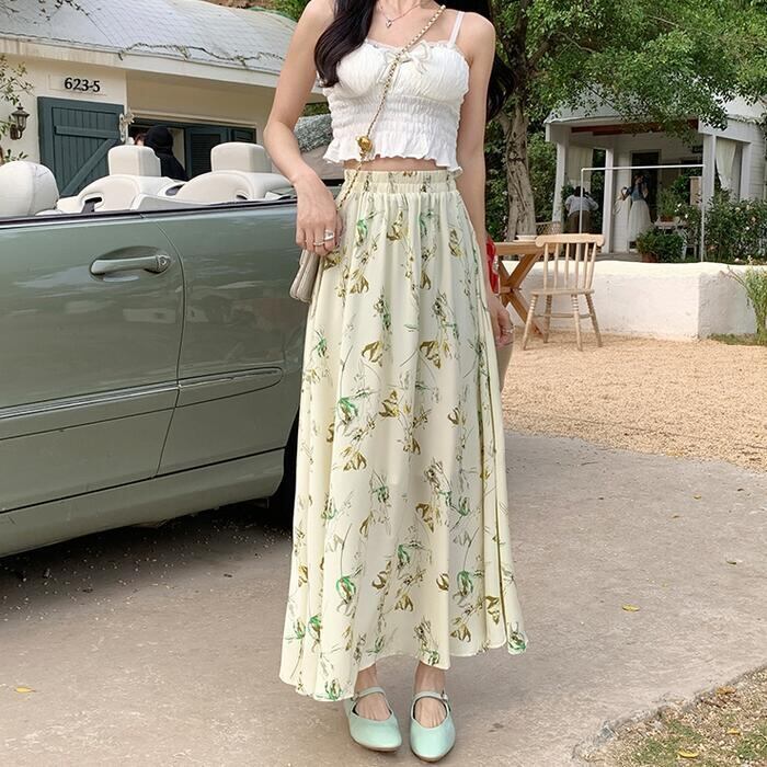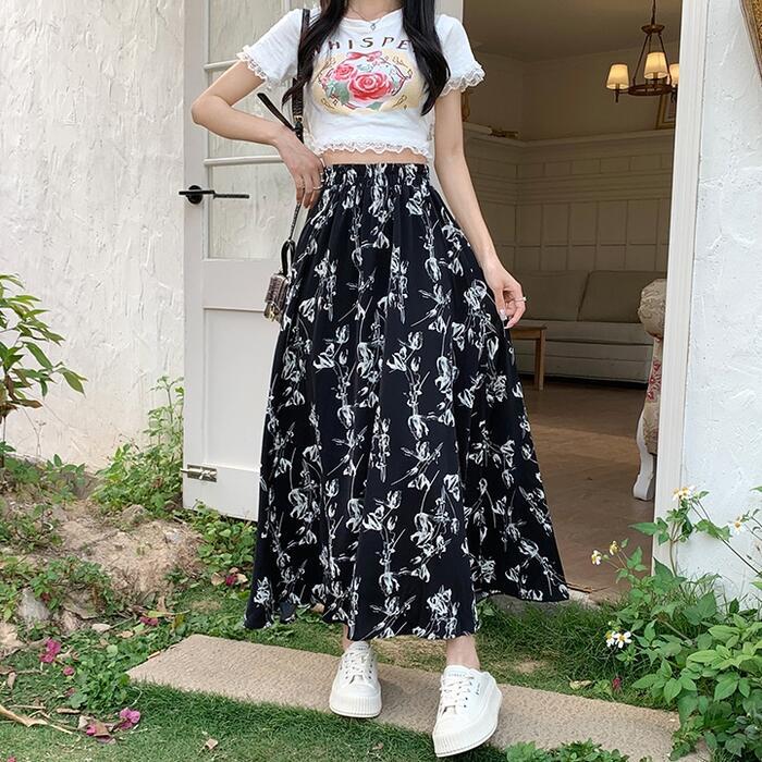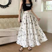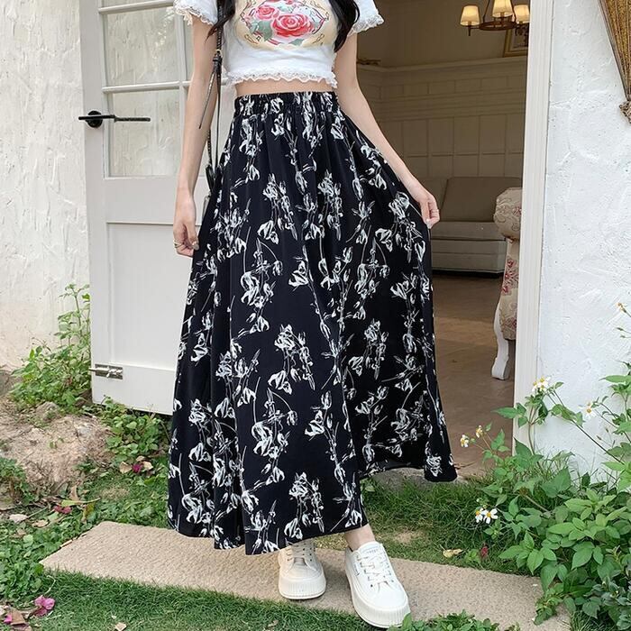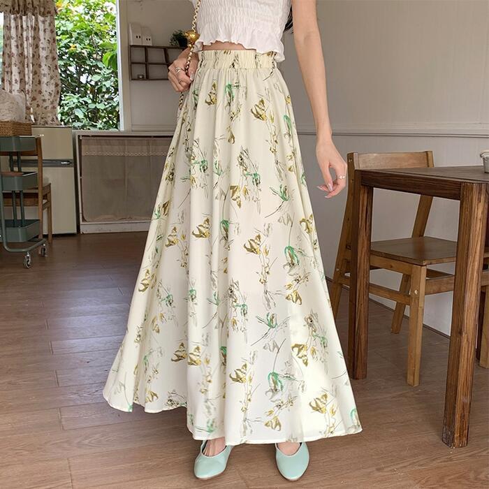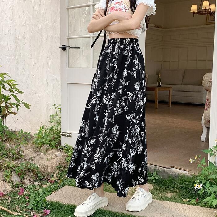 絵画調の細やかなタッチで描かれたフラワープリントロングスカート。
