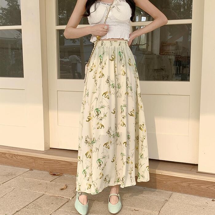 全3色 大きいサイズ 体型カバー ボトムス スカート レディース 花柄 フラワー ボタニカル エレガント きれいめ カジュアル シフォン ロング丈 大人 可愛い フレアスカート おしゃれ フェミニン ウエストゴム 楽ちん ベージュ ブラック 黒 ホワイト 白 春 秋 夏 20代 30代 40代 50代
