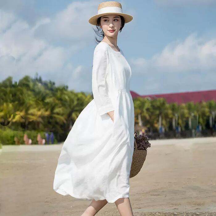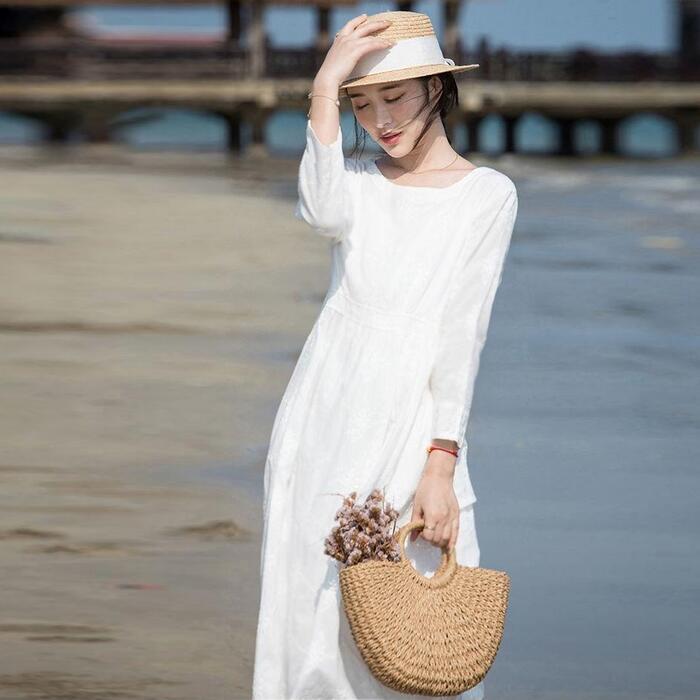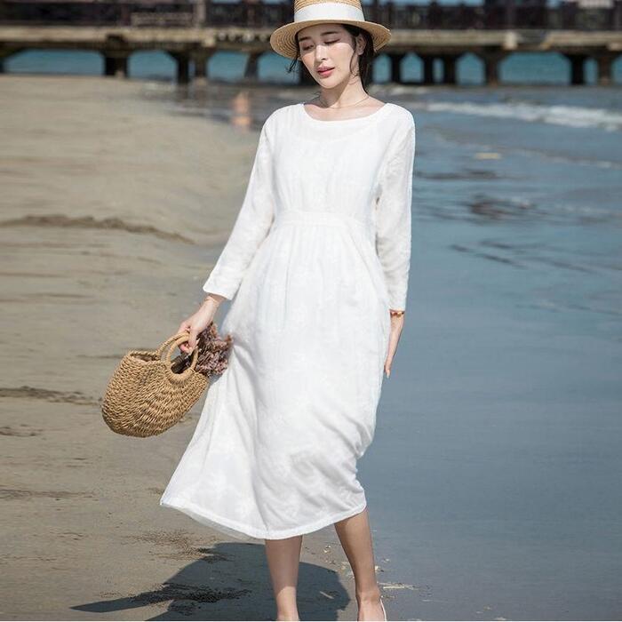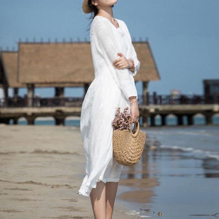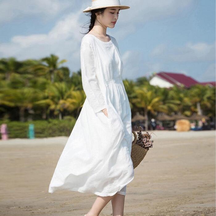 大きいサイズ ワンピース ワンピ ドレス レディース 袖あり エレガント きれいめ カジュアル 長袖 大人 可愛い フェミニン Aライン ミモレ丈 ゆったり ナチュラル シンプル リゾート 体型カバー ホワイト 白 春 秋 夏 20代 30代 40代 50代