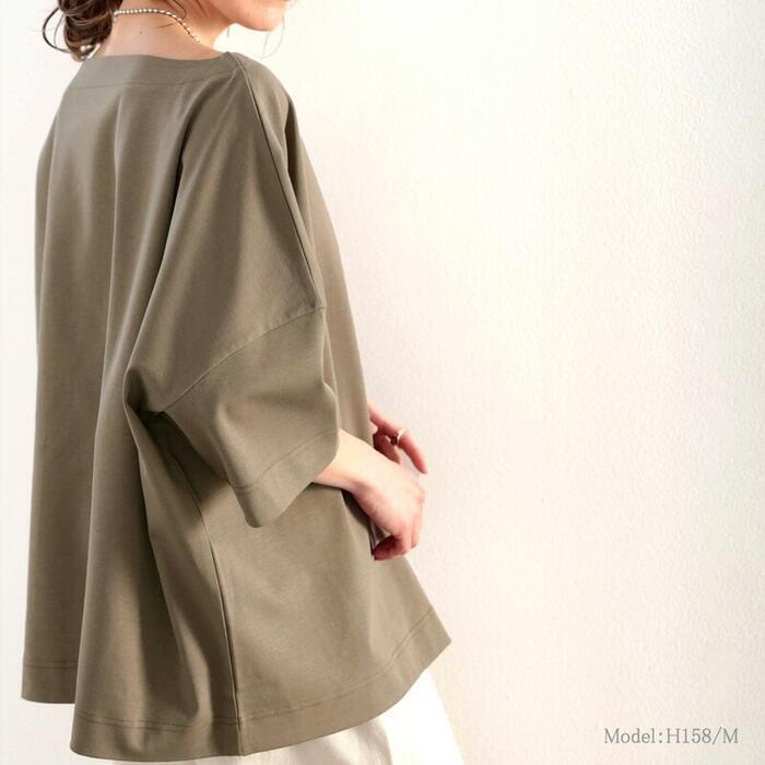 体のラインを拾わないゆったり感で抜け感を演出。