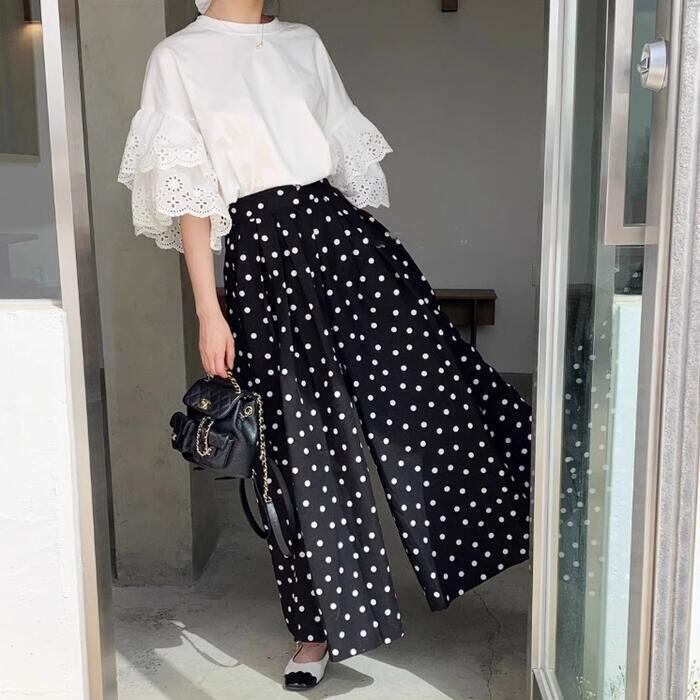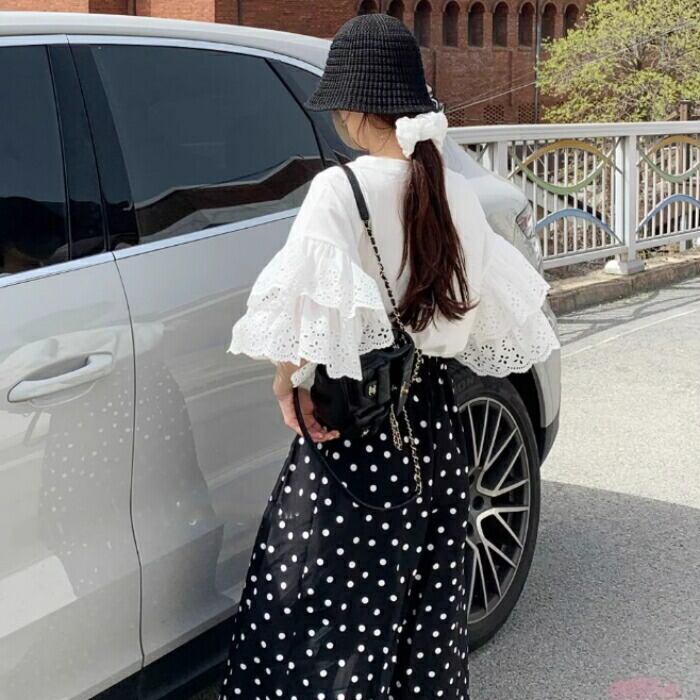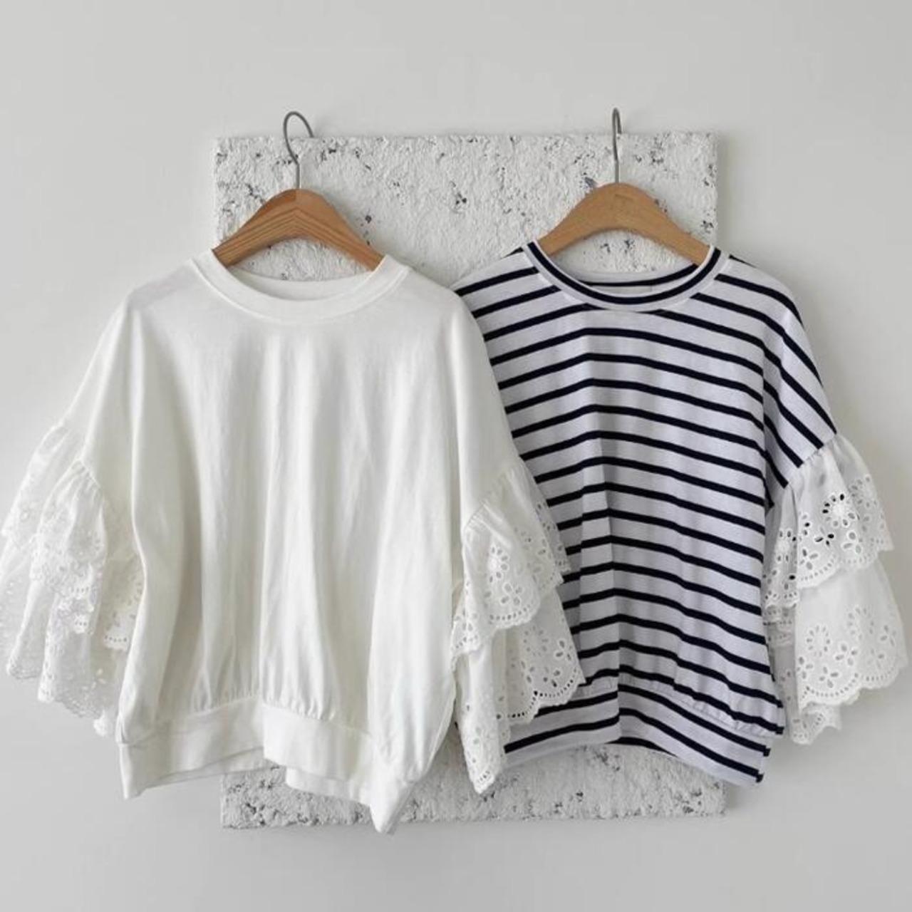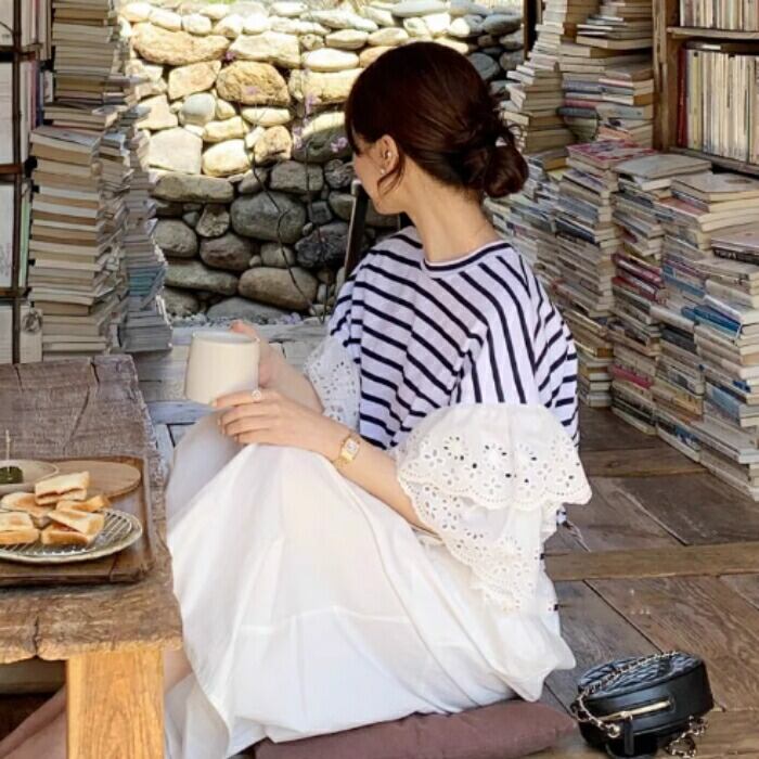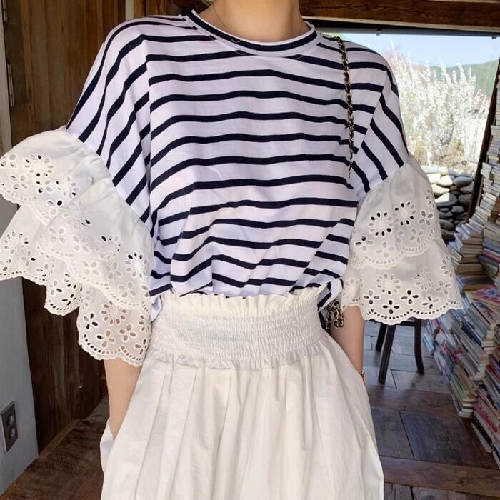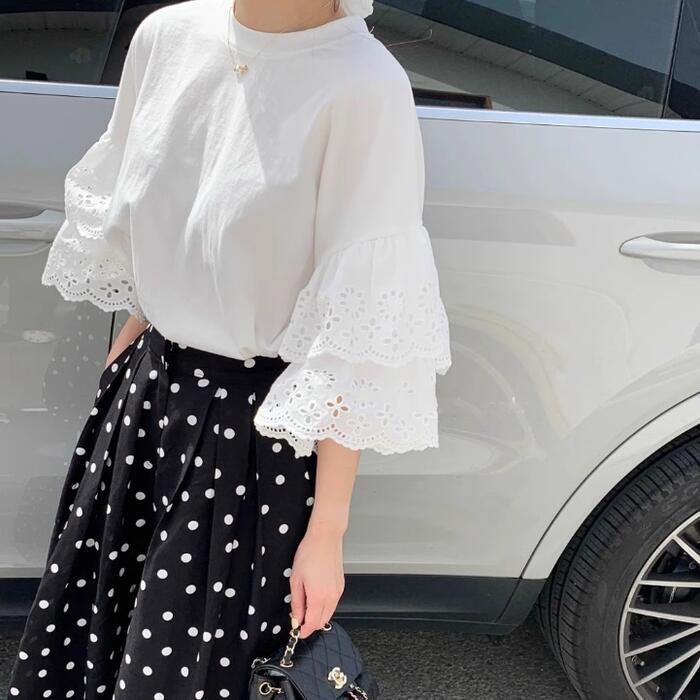 存在感のあるレーススリーブが目を惹くTシャツ。