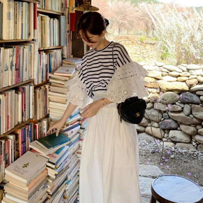 全2色 大きいサイズ トップス シャツ Tシャツ カットソー プルオーバー レース フリルスリーブ レディース 五分袖 エレガント きれいめ カジュアル フェミニン ボーダー 無地 大人 可愛い 体型カバー ホワイト 白 春 秋 夏 20代 30代 40代 50代