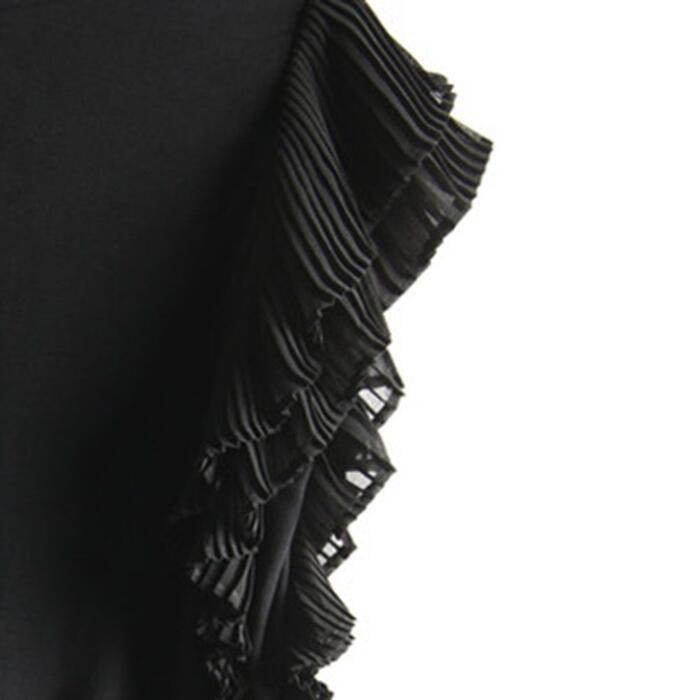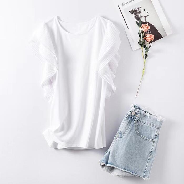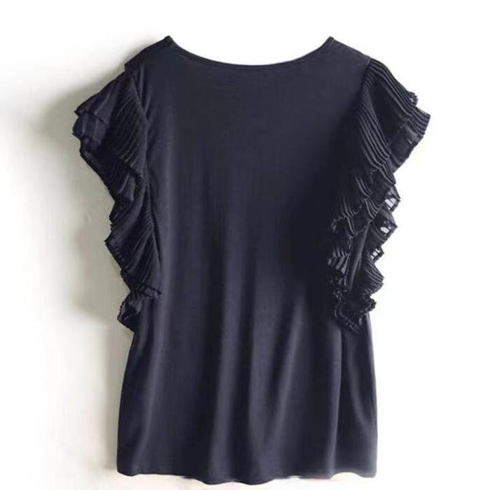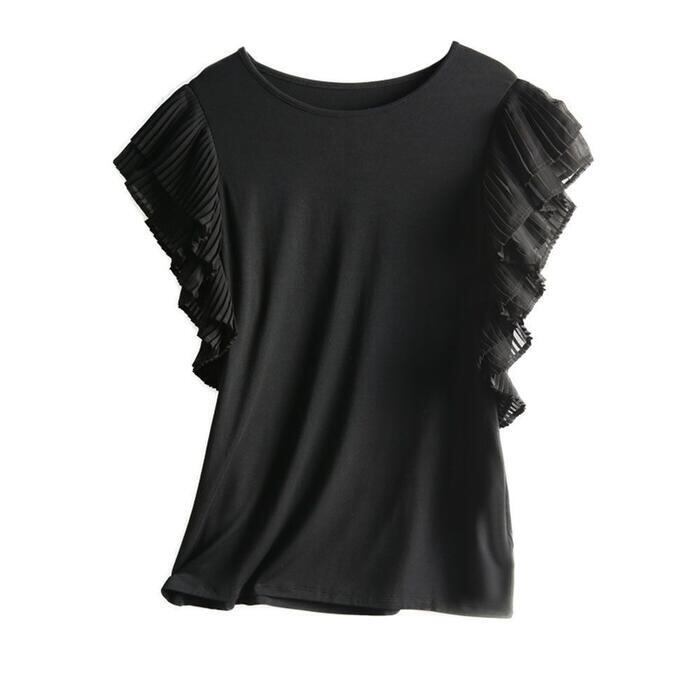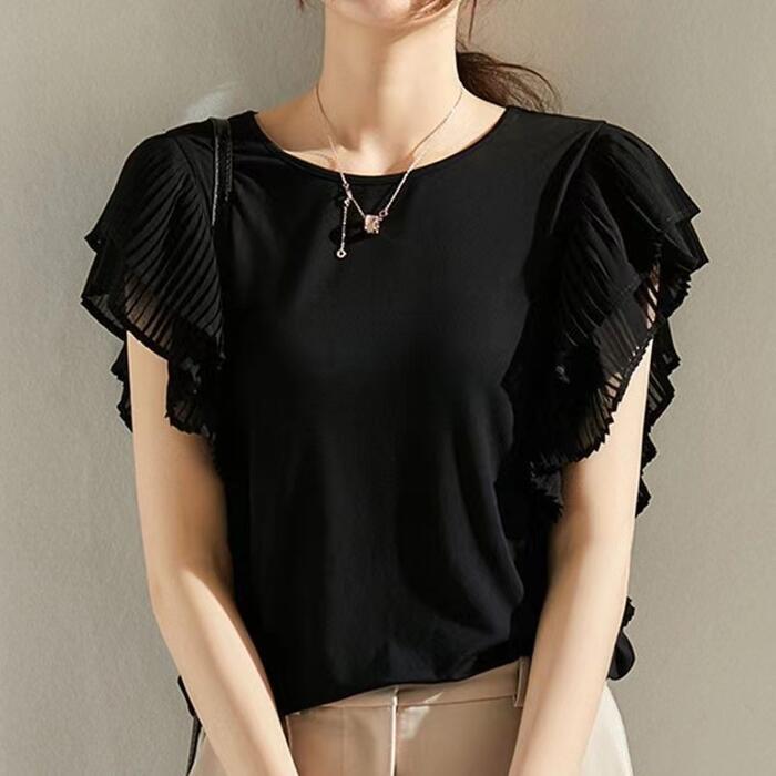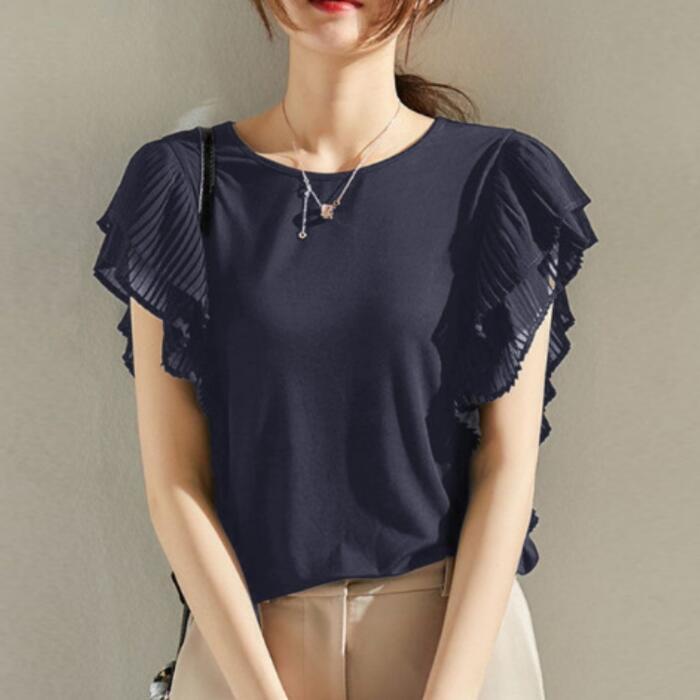 全3色 大きいサイズ 体型カバー トップス シャツ Tシャツ ブラウス カットソー プルオーバー フリルスリーブ プリーツ レディース 半袖 エレガント きれいめ カジュアル フェミニン 通勤 オフィス シンプル 大人 可愛い ネイビー ブラック 黒 ホワイト 白 春 秋 夏 20代 30代 40代 50代