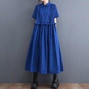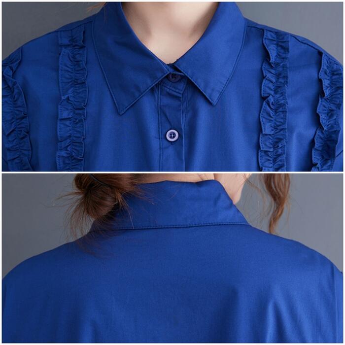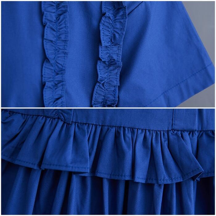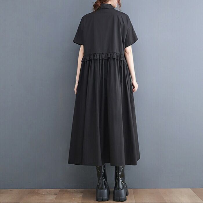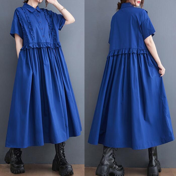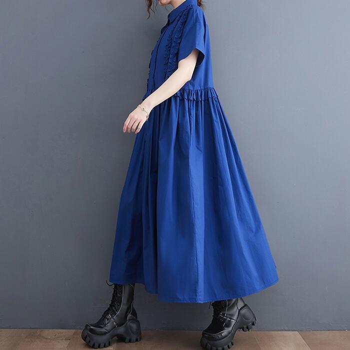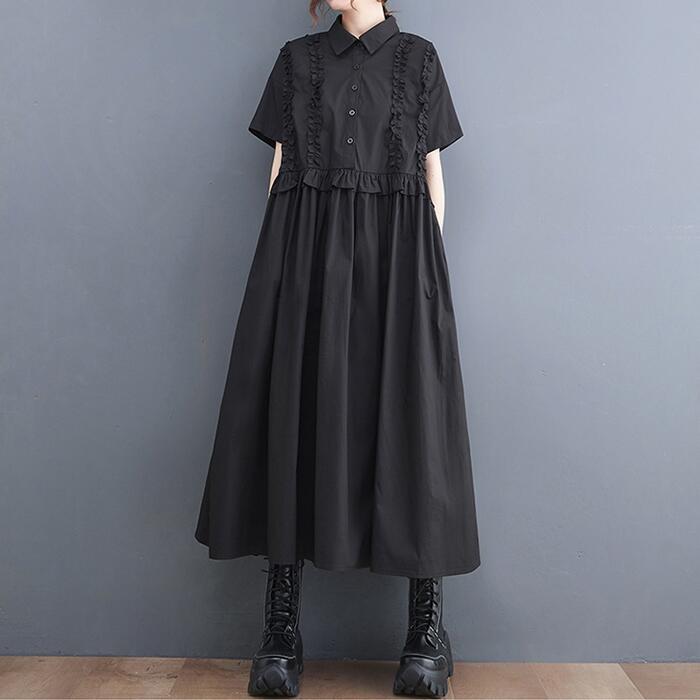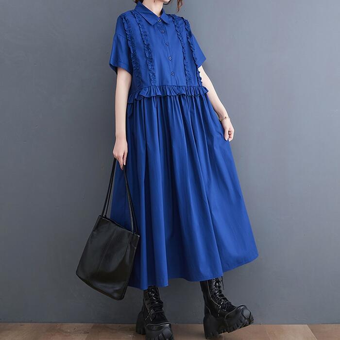 全2色 大きいサイズ ワンピース ワンピ ドレス シャツワンピ レディース フリル エレガント きれいめ カジュアル 大人 可愛い 半袖 フェミニン ミモレ丈 ゆったり 体型カバー 楽ちん 切り替え ブルー 青 ブラック 黒 春 秋 夏 20代 30代 40代 50代