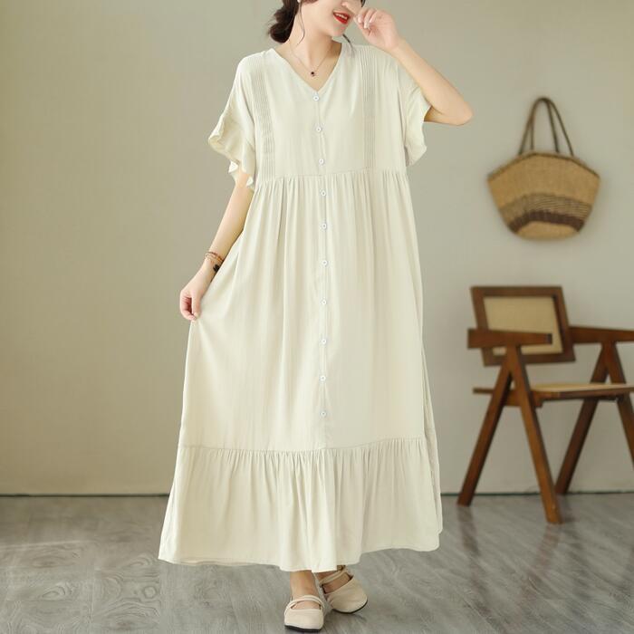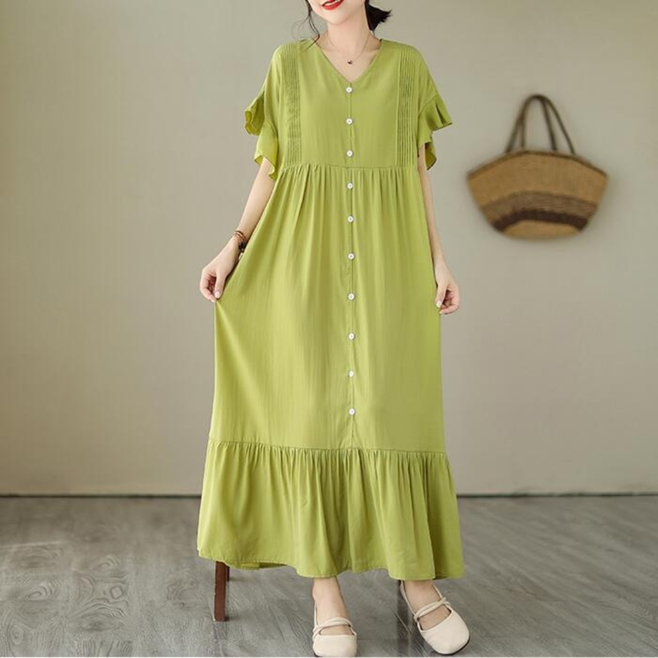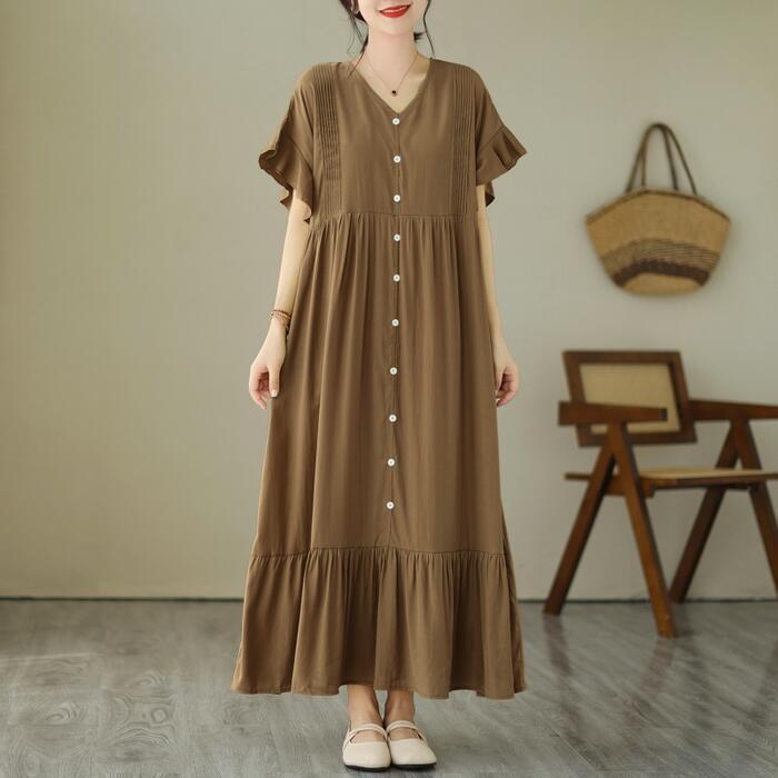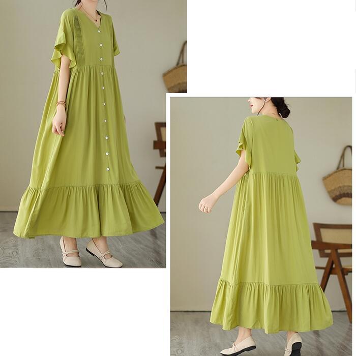 全6色 大きいサイズ 楽ちん シンプル ワンピース ワンピ ドレス フレア フリル レディース エレガント きれいめ カジュアル 大人 可愛い 半袖 フェミニン ロング丈 ゆったり 体型カバー ブルー 青 レッド 赤 グリーン 緑 ベージュ ブラック 黒 春 秋 夏 20代 30代 40代 50代