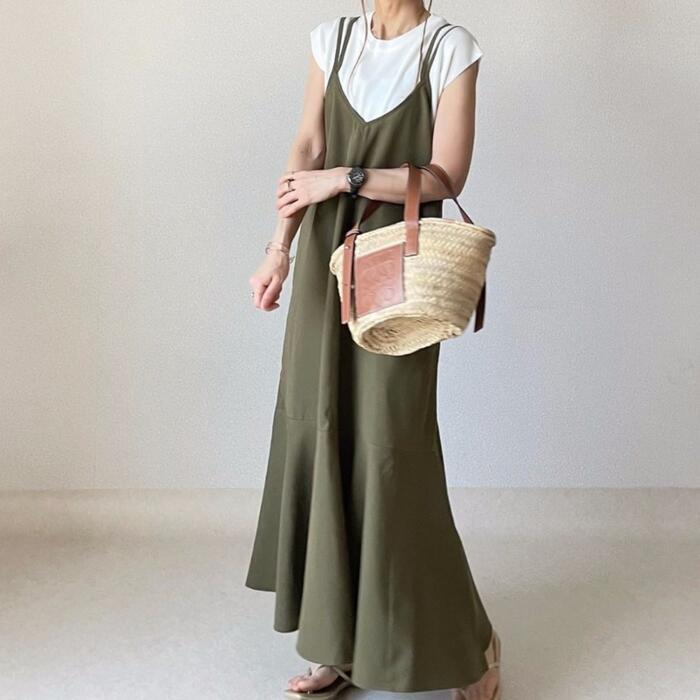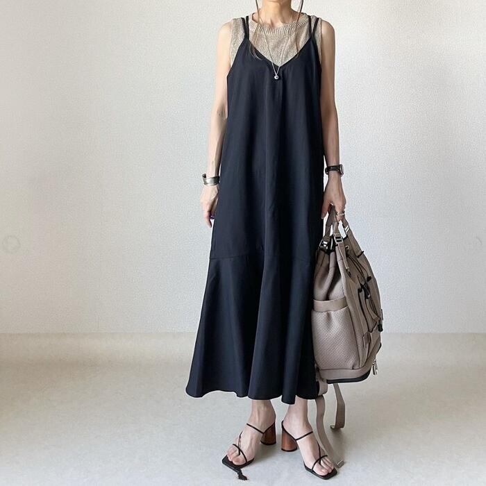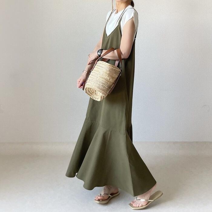 裾に向かって綺麗にボリュームが広がるフレアキャミワンピース。