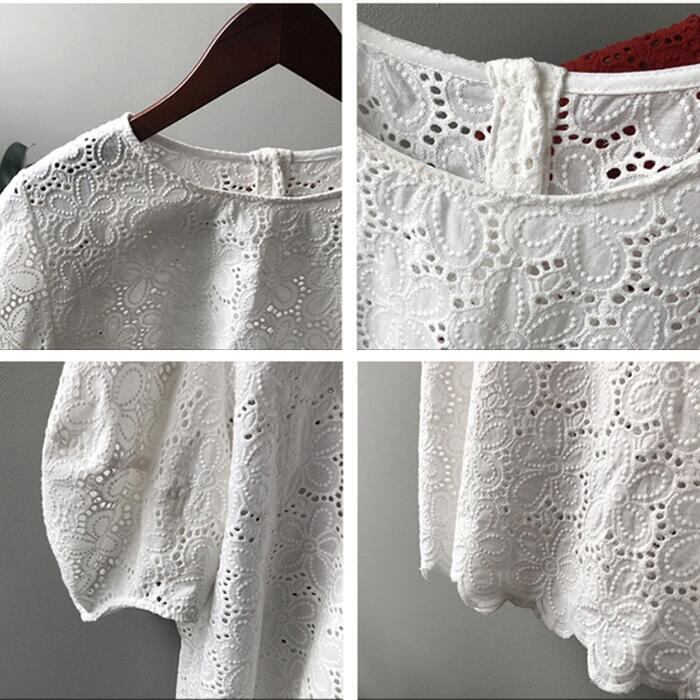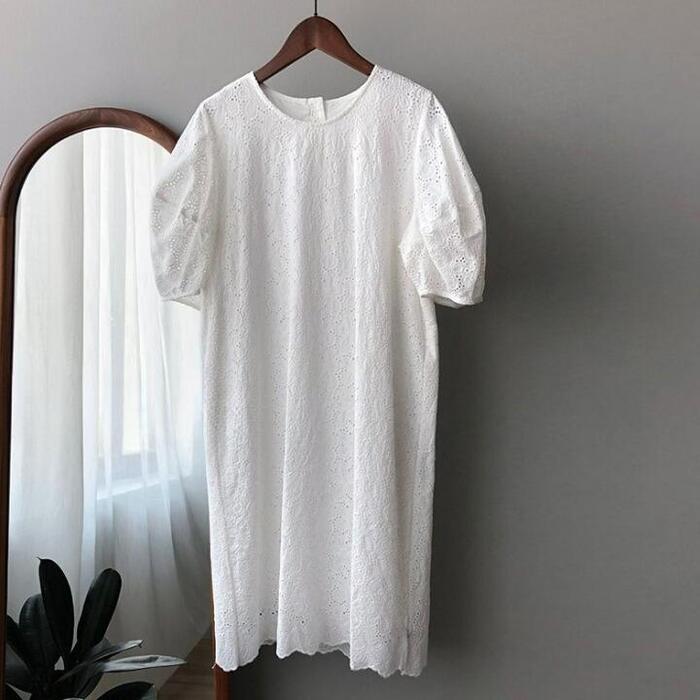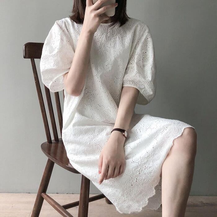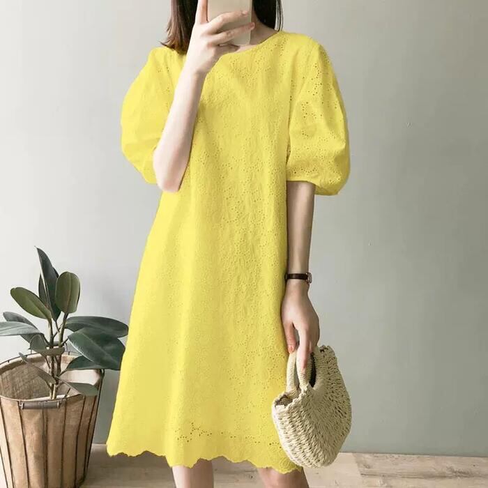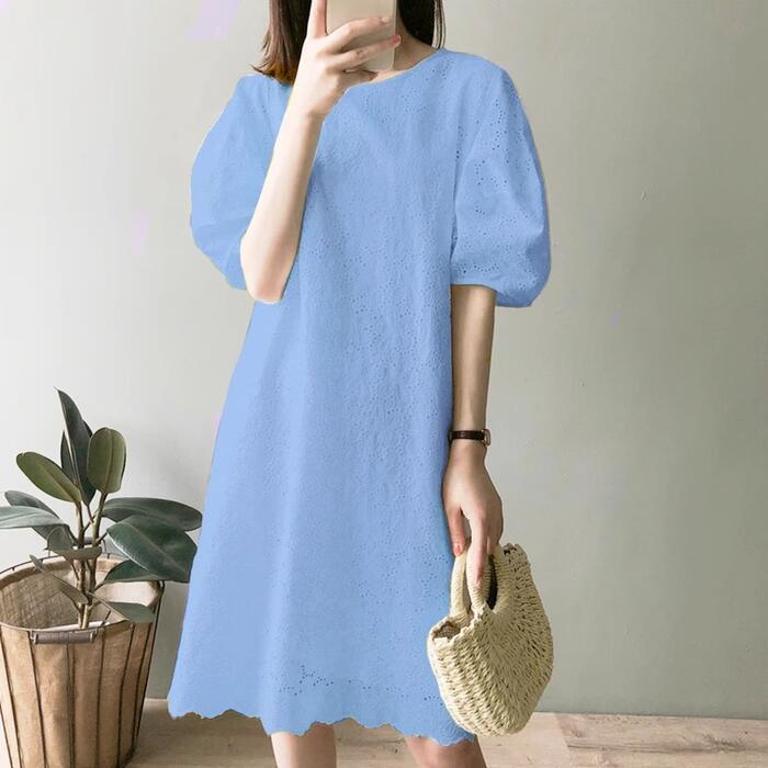 全3色 大きいサイズ ゆったり 体型カバー パフスリーブ ワンピース ワンピ ドレス カットワーク レース 袖あり レディース チュニック エレガント きれいめ カジュアル 五分袖 大人 可愛い フェミニン 膝丈 お呼ばれ シンプル 青 ブルー イエロー ホワイト 白 春 秋 夏 20代 30代 40代 50代