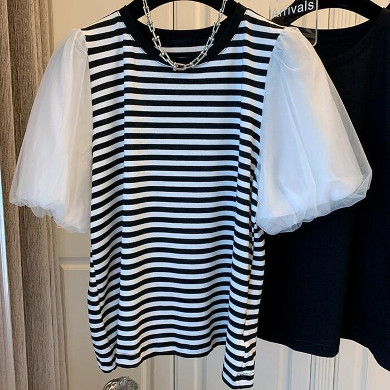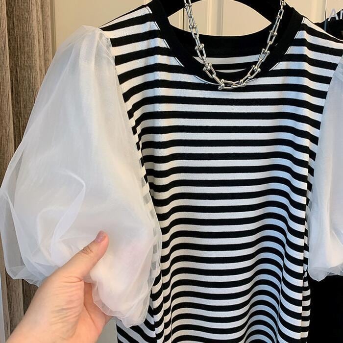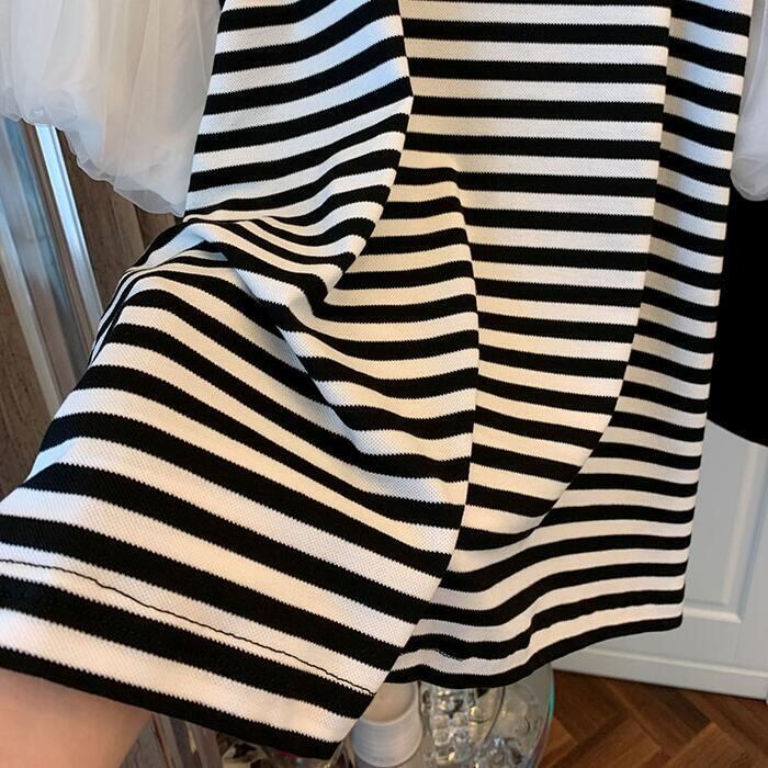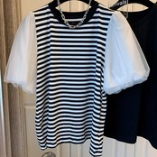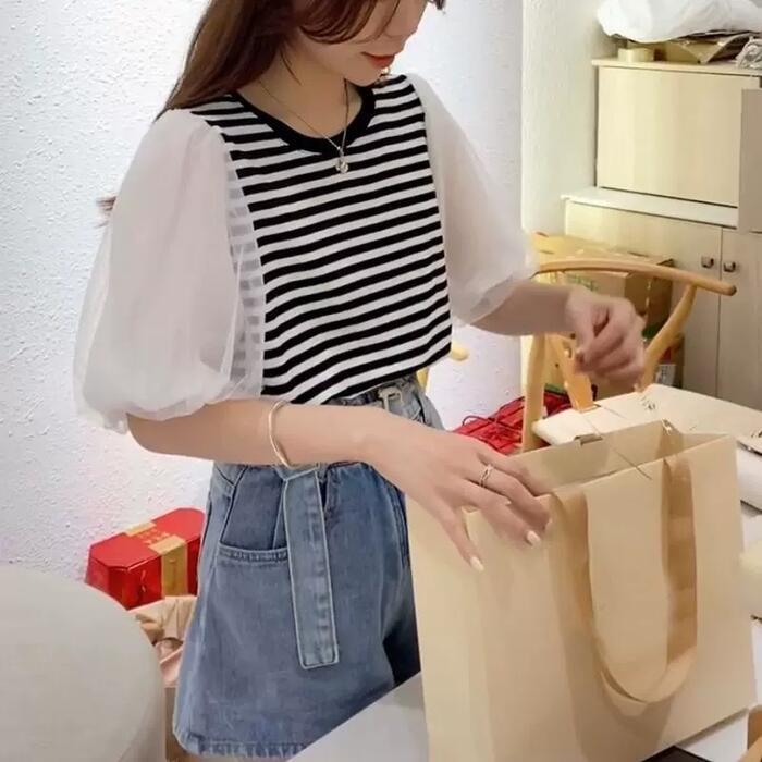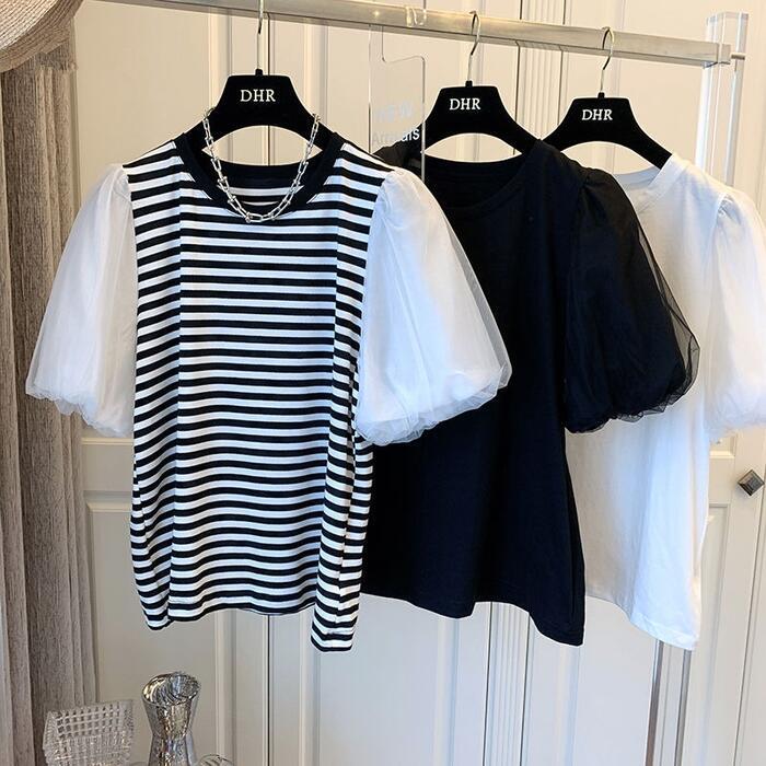 全3色 大きいサイズ パフスリーブ トップス シャツ Tシャツ カットソー チュール プルオーバー ボーダー レディース エレガント 大人 可愛い きれいめ カジュアル フェミニン 半袖 体型カバー シンプル ブラック 黒 ホワイト 白 春 秋 夏 20代 30代 40代 50代