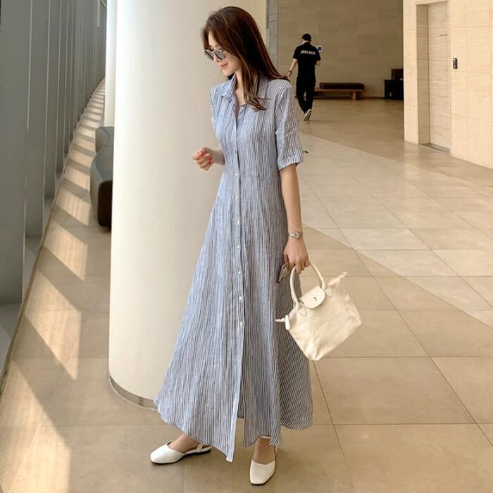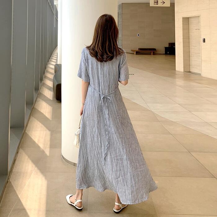大きいサイズ ワンピース ワンピ ドレス シャツワンピ ストライプ 袖あり レディース エレガント きれいめ カジュアル 半袖 大人 可愛い フェミニン ロング丈 Aライン フレア リボン シンプル ゆったり 体型カバー 春 秋 夏 20代 30代 40代 50代