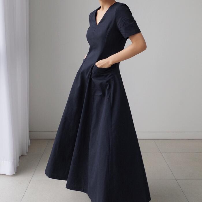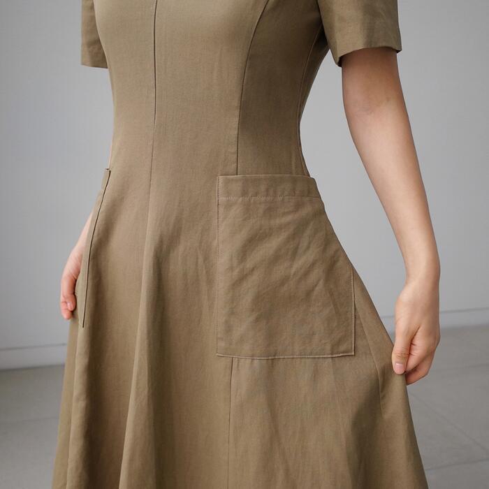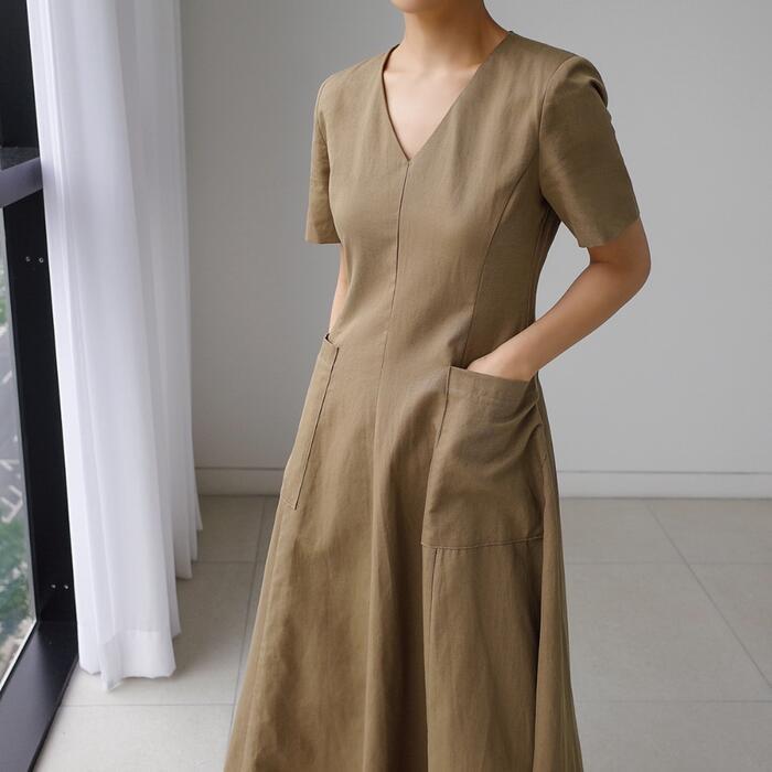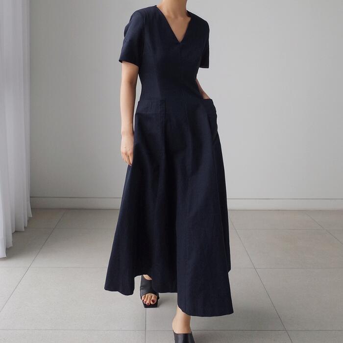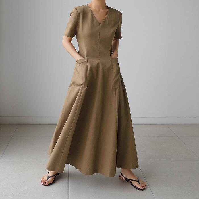 フロントのポケットがポイントのVネックワンピース。