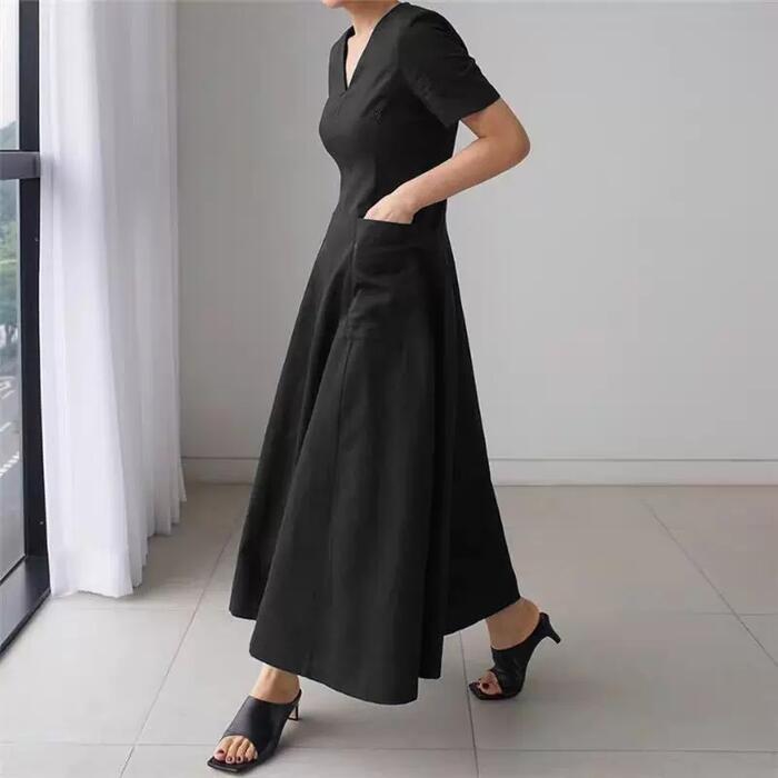全3色 大きいサイズ ゆったり Vネック ワンピース ワンピ ドレス シャツワンピ ポケット 袖あり レディース エレガント きれいめ カジュアル 半袖 大人 可愛い フェミニン ロング丈 Aライン フレア シンプル 体型カバー ベージュ ネイビー ブラック 黒 春 秋 夏 20代 30代 40代 50代