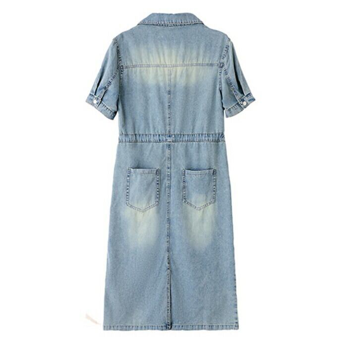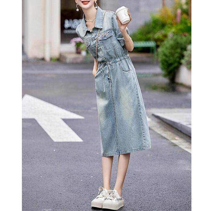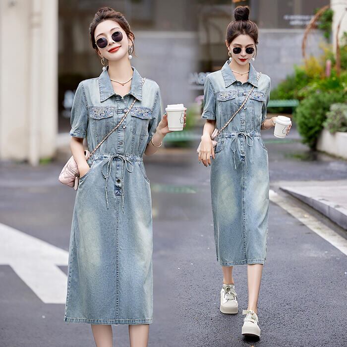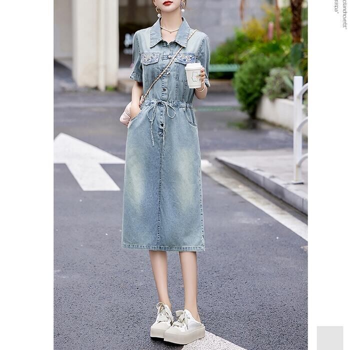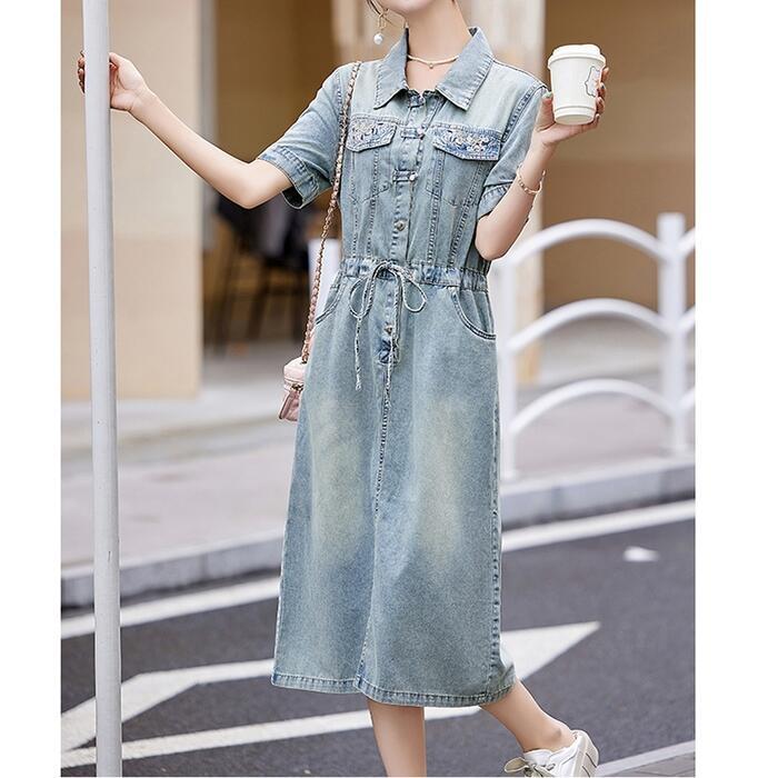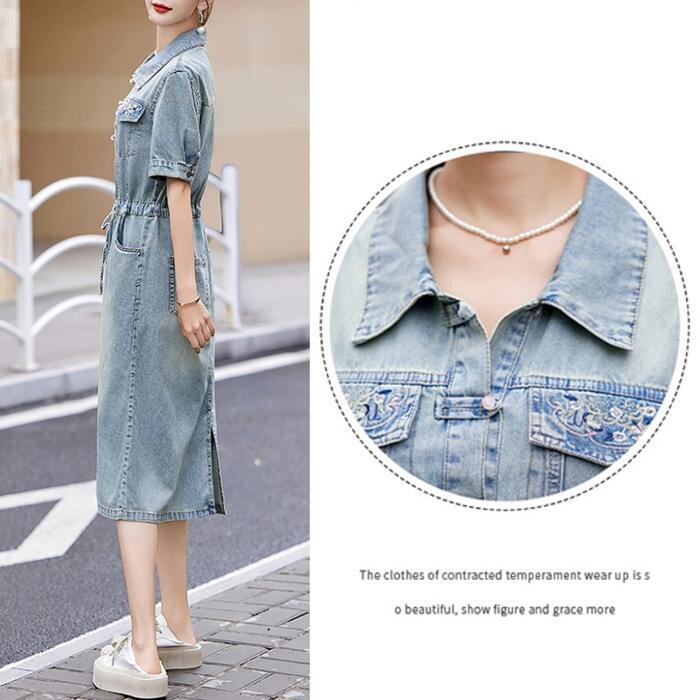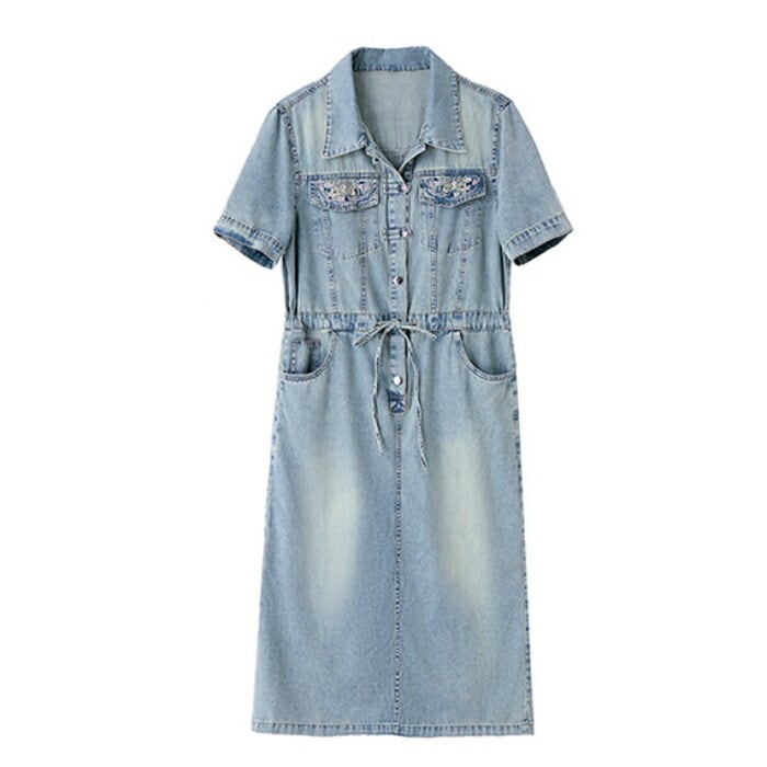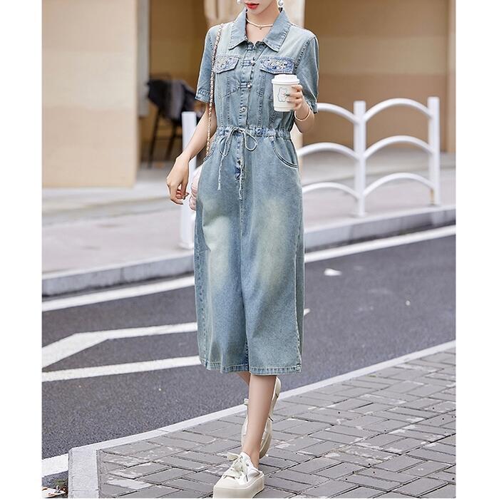 大きいサイズ デニム ワンピース ワンピ ドレス シャツワンピ 袖あり レディース エレガント きれいめ カジュアル 半袖 刺繍 大人 可愛い フェミニン ミモレ丈 ドロスト シンプル 体型カバー 青 ブルー 春 秋 夏 20代 30代 40代 50代