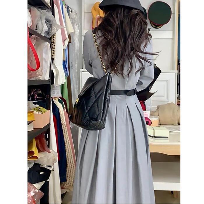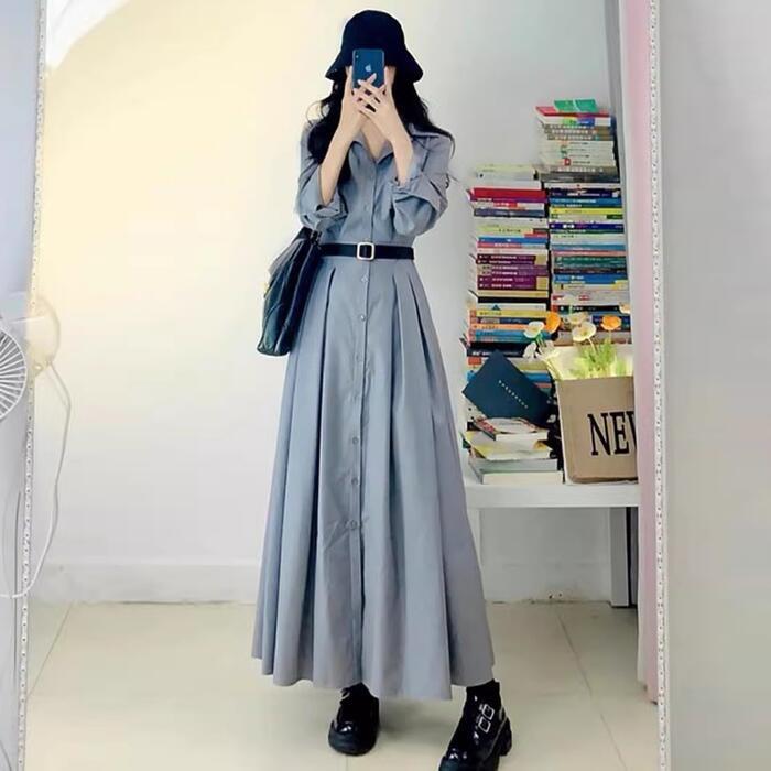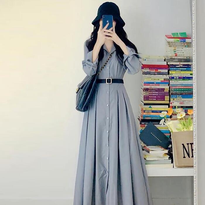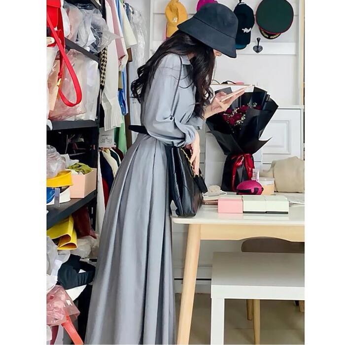 大きいサイズ ワンピース ワンピ ドレス シャツワンピ 袖あり プリーツ レディース エレガント きれいめ カジュアル 長袖 大人 可愛い フェミニン ロング丈 ウエストベルト シンプル 体型カバー グレー 春 秋 夏 20代 30代 40代 50代