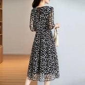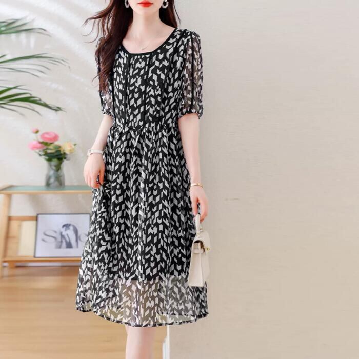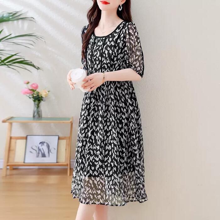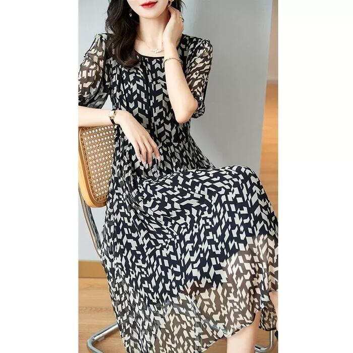 大きいサイズ 体型カバー ワンピース ワンピ ドレス 袖あり プリント チェック モザイク レディース 幾何柄 エレガント きれいめ カジュアル 五分袖 大人 可愛い フェミニン ミモレ丈 Aライン ハイウエスト シフォン ブラック 黒 春 秋 夏 20代 30代 40代 50代