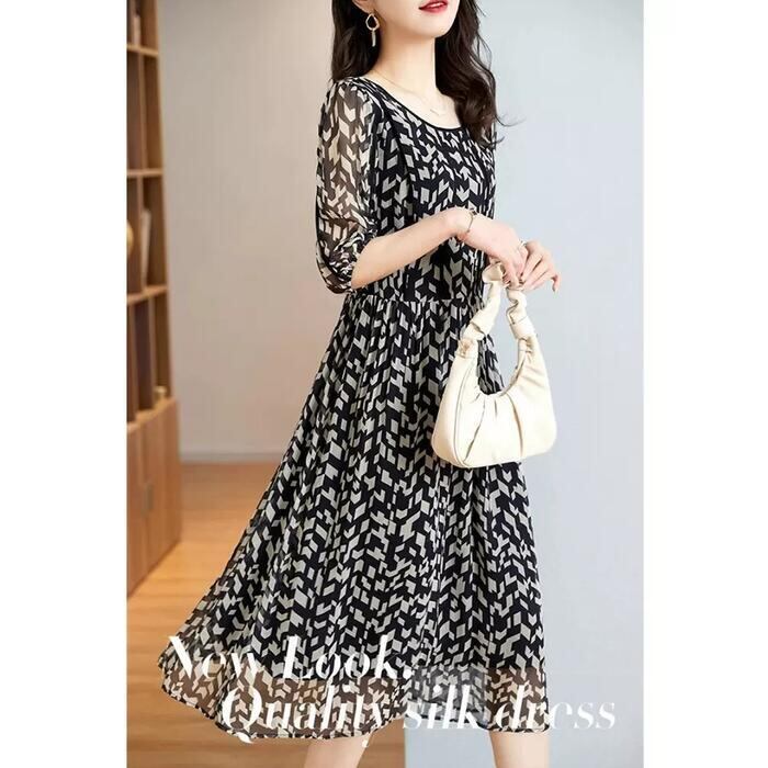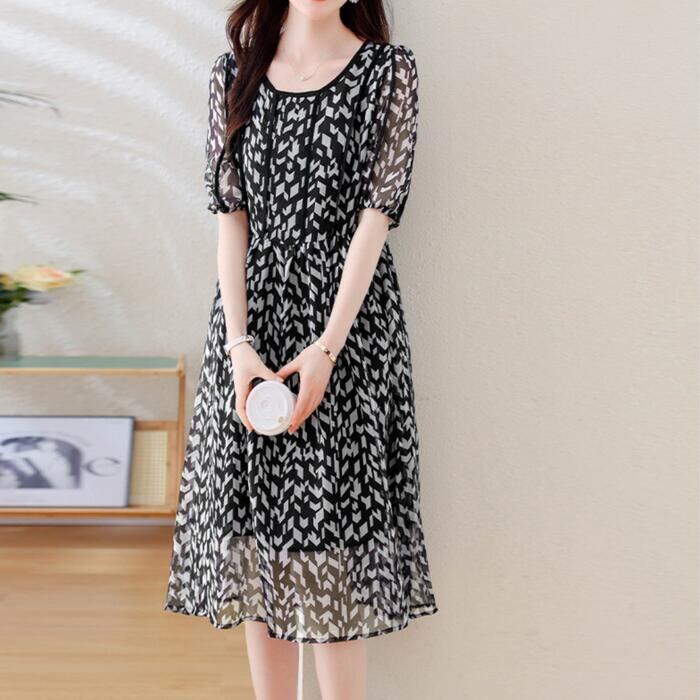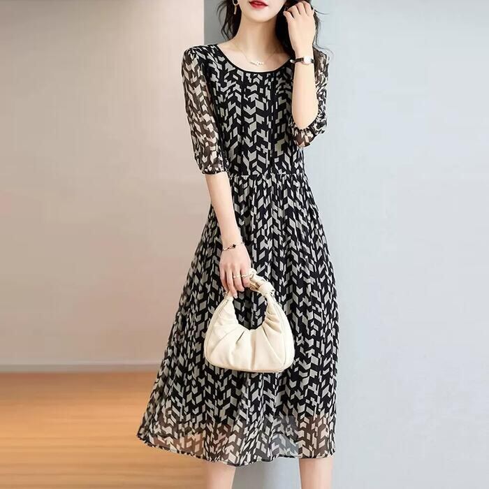 モノトーンカラーのモザイク柄が大人な雰囲気の五分袖ワンピース。