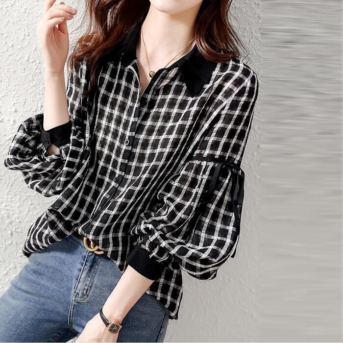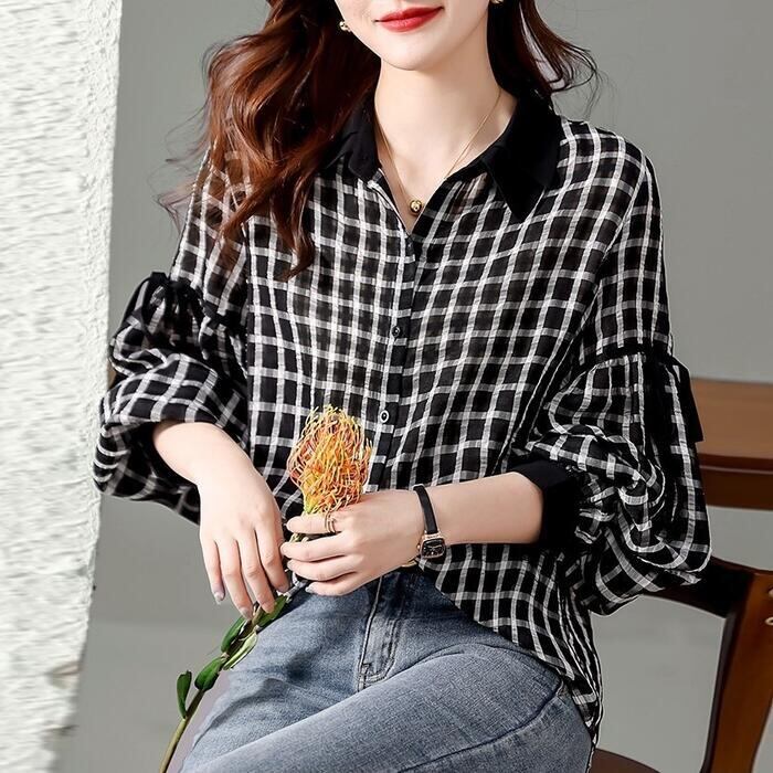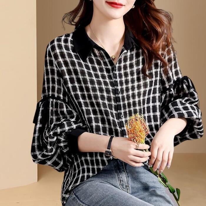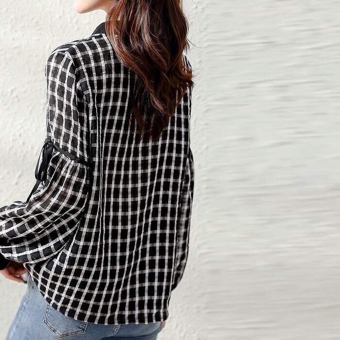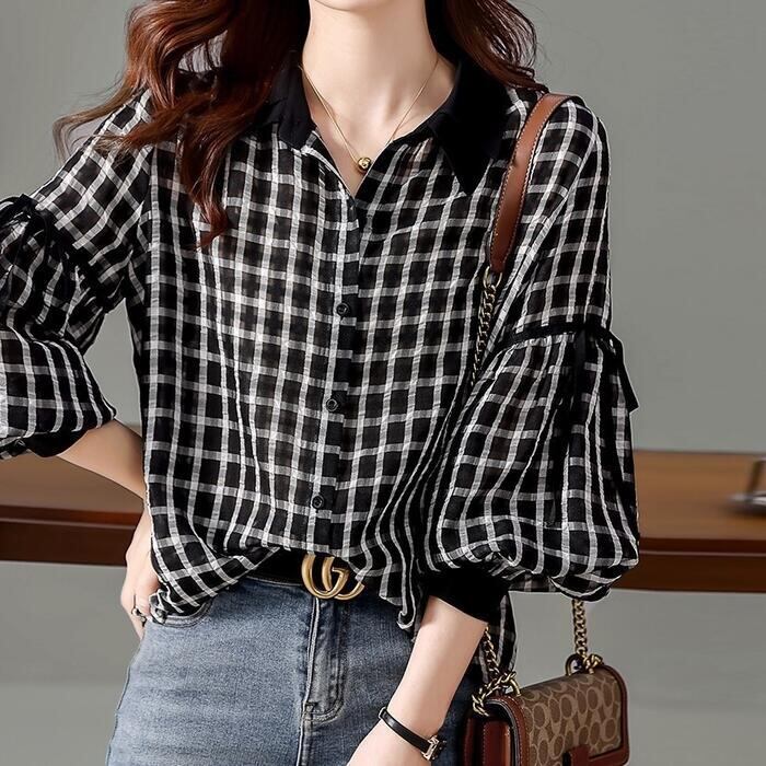 ふんわり袖が大人可愛いチェック柄シャツ。