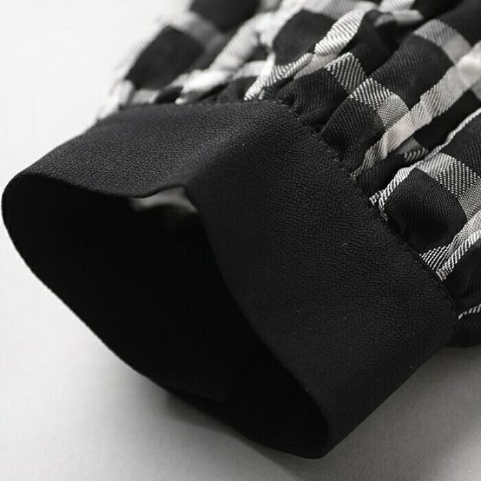 大きいサイズ パフスリーブ トップス シャツ ブラウス チェック レディース エレガント 大人 可愛い きれいめ カジュアル フェミニン 長袖 袖コンシャス 体型カバー 羽織り リボン ナチュラル 通勤 オフィス ブラック 黒 春 秋 夏 20代 30代 40代 50代
